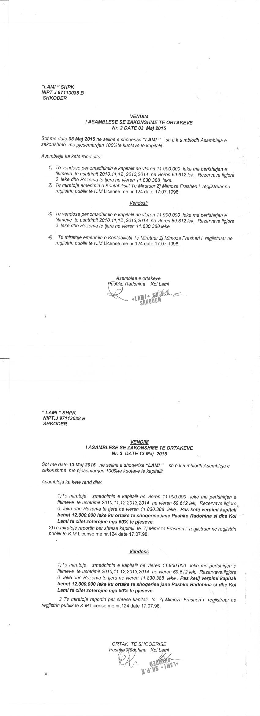 → Ekstrakti Historik i Regjistrit Tregtar date 15.02.2022 → Statuti i Shoqerise → Vendim i asamblese se zakonshme te ortakeve date 03.05.2015 |