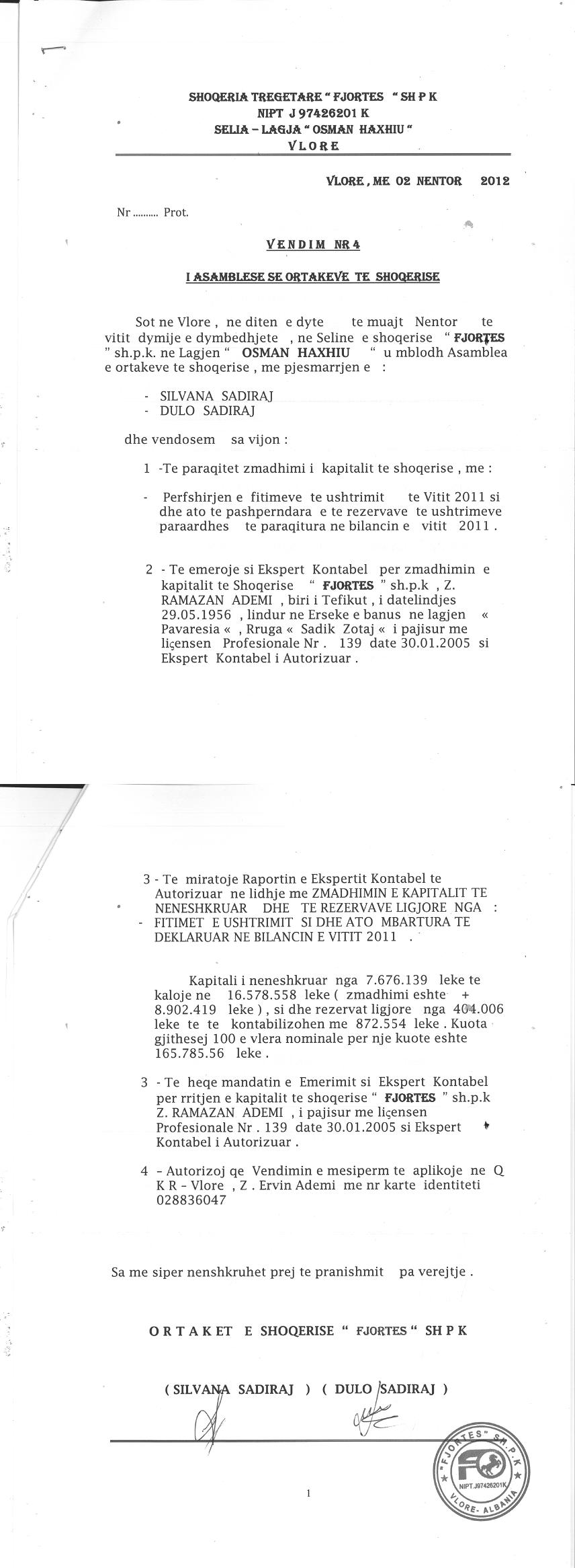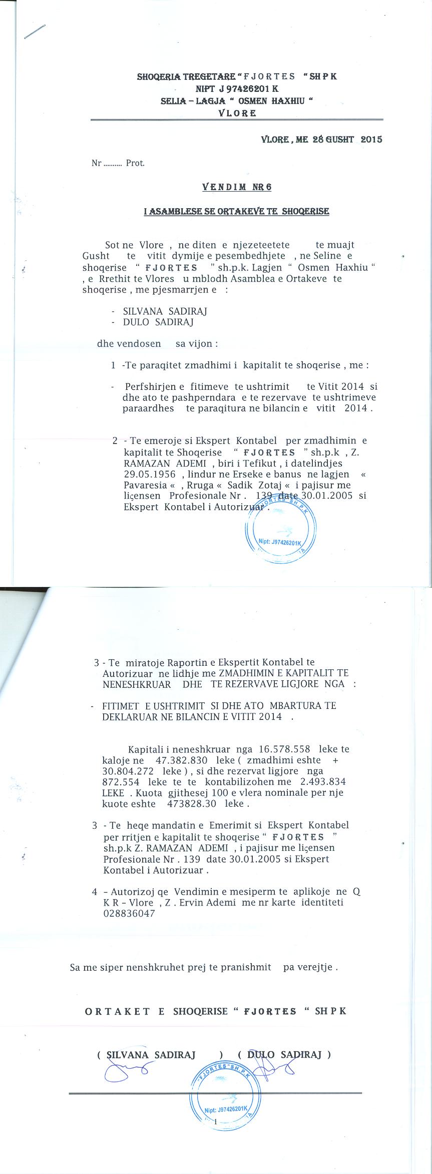 → Ekstrakti Historik i Regjistrit Tregtar date 02.10.2021 → Statuti i Shoqerise → Vendim i Asamblese se Pergjithshme per rritjen e kapitalit date 02.11.2012 → Vendim i Asamblese se Pergjithshme per rritjen e kapitalit date 20.08.2015 → Ekstrakti Historik i Regjistrit Tregtar 13.06.2025 |