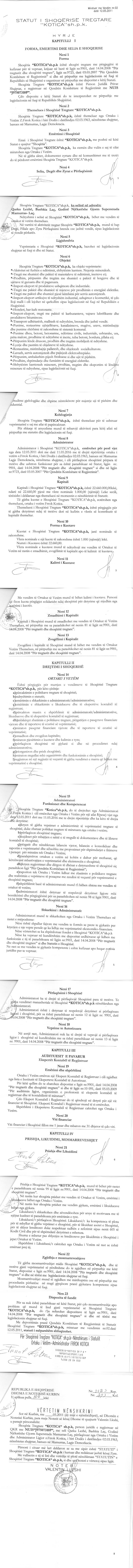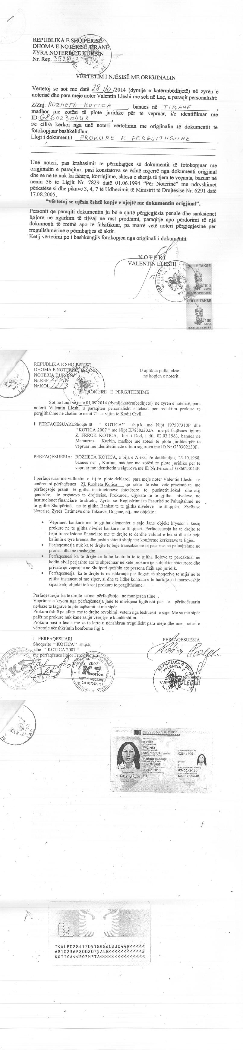 | Çështje Ligjore: | I.Me date 01.09.2014, eshte depozituar Prokura e Përgjithshme nr.2748 rep. 1213 kol. me palë: I Përfaqësuar, Shoqëria “Kotica” me NUIS (NIPT)-J97507310P,