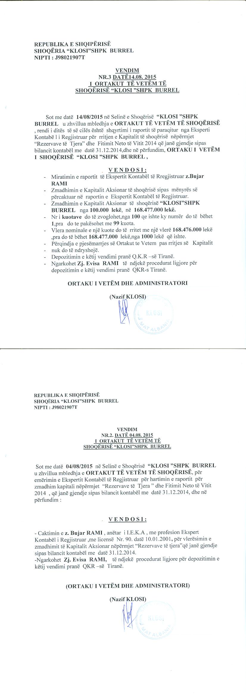 → Ekstrakt Historik i Regjistrit Tregtar date 24.01.2024 → Akt themelimi dhe Statuti i Shoqerise → Dokumente të Ndryshme → Vendim i Ortakut të Vetëm, Zmadhim Kapitali datë 14.08.2015 |
