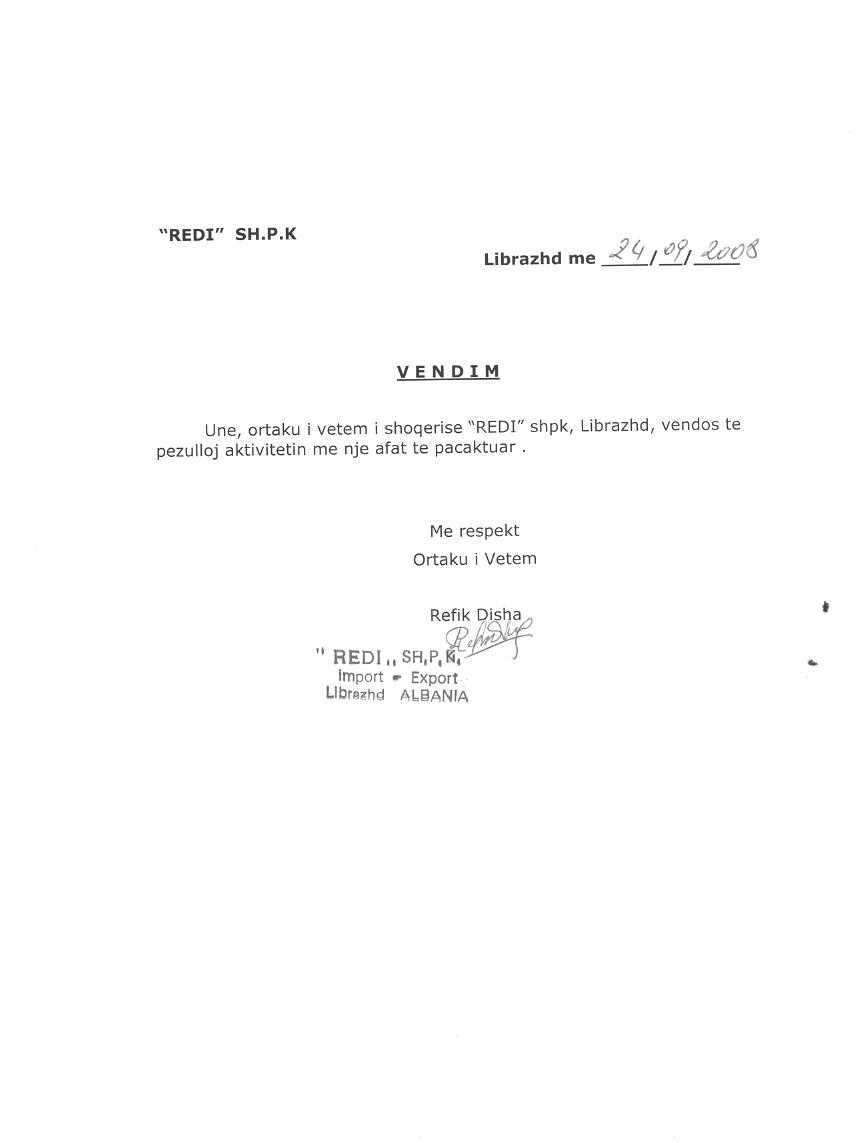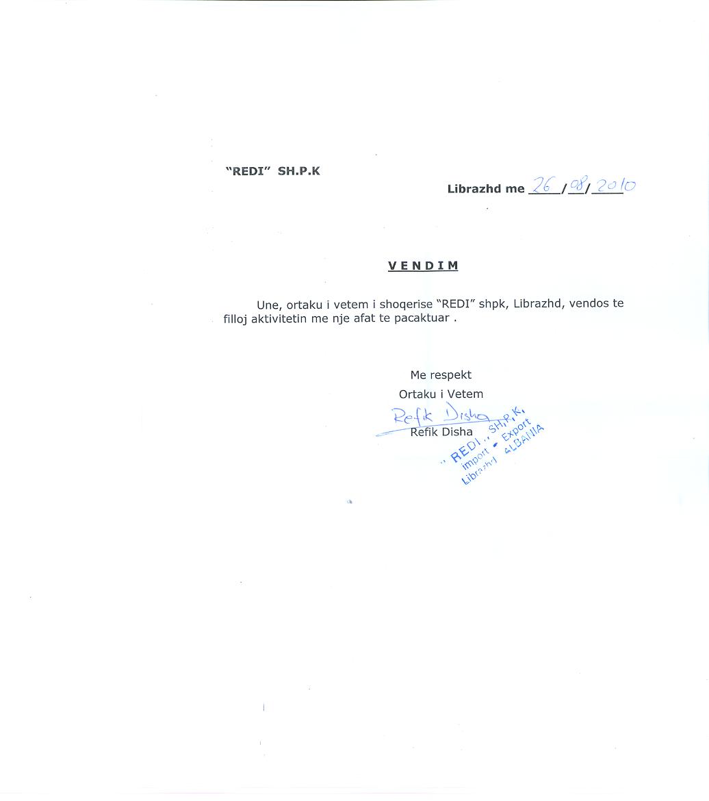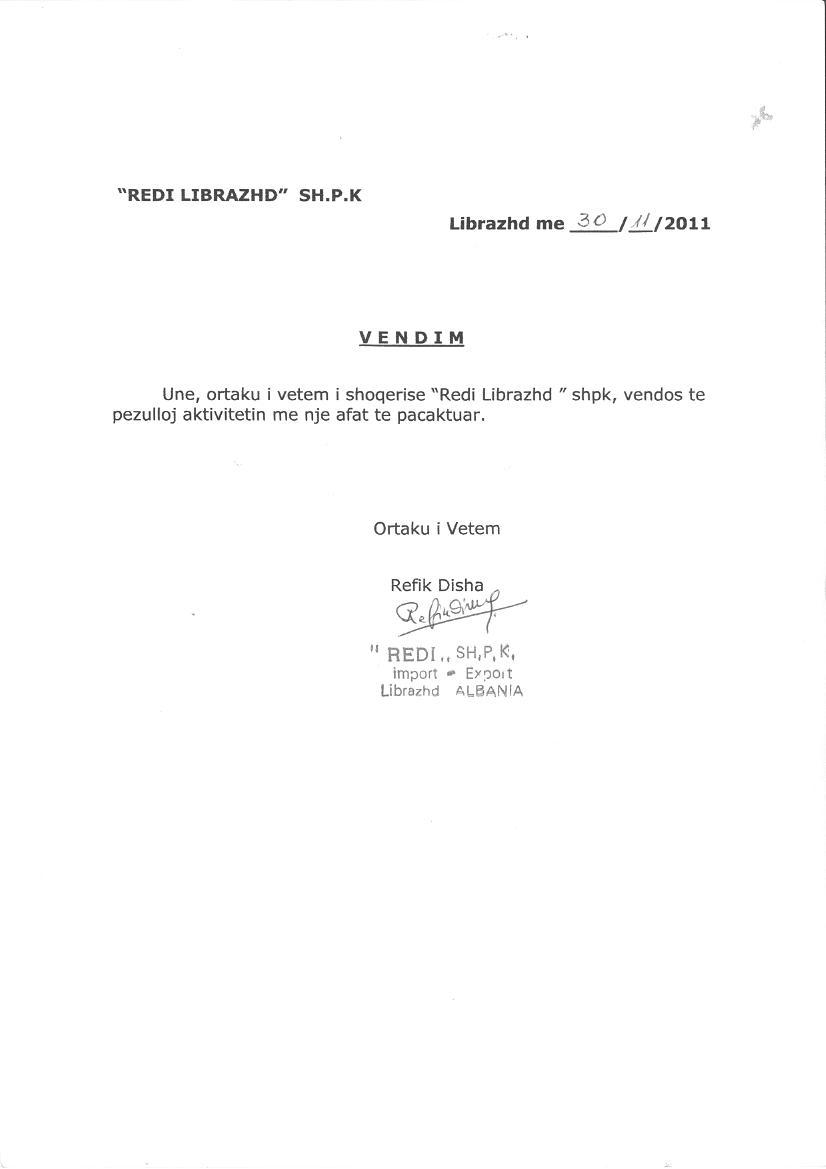 → Ekstrakt historik i regjistrit tregtar date 28.01.2022 → Vendimi i ortakut te vetem per aktivizimin e shoqerise date 26.08.2010 → Vendimi i ortakut te vetem per pezullimin e aktivitetit date 30.11.2011 → Vendimi i ortakut te vetem per pezullimin e aktivitetit date 24.09.2008 |