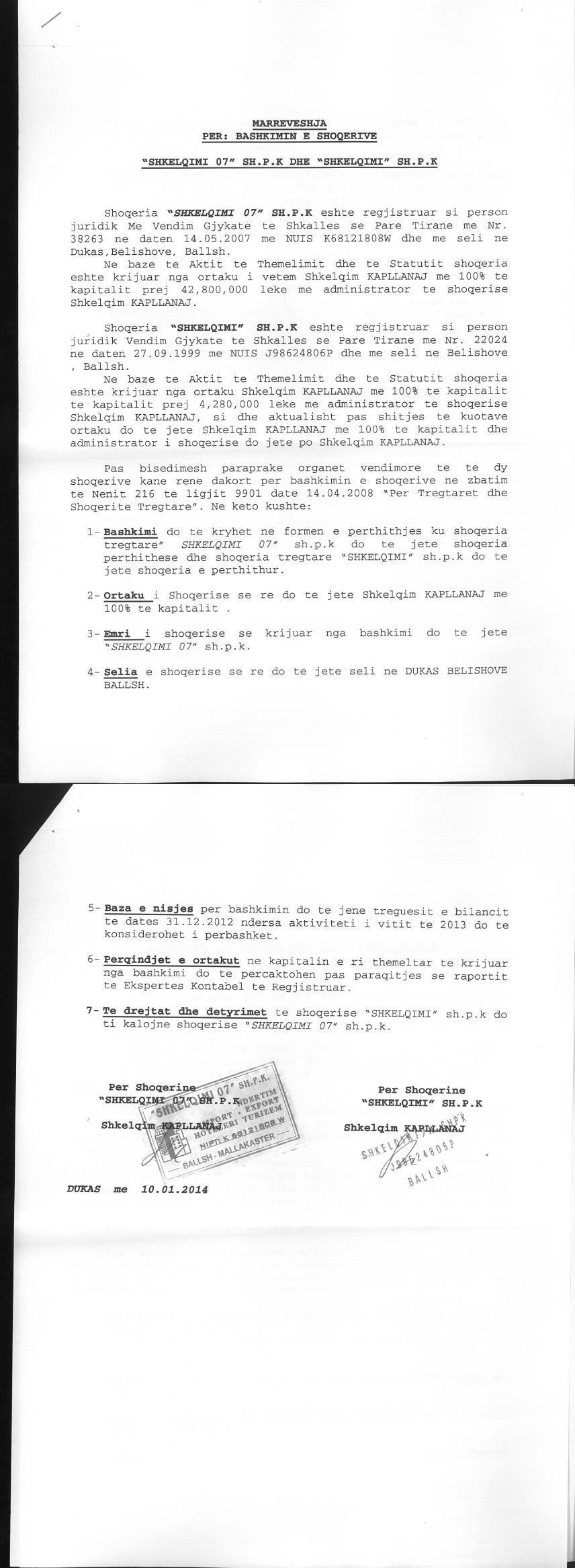 | Çështje Ligjore: | Me date 10.01.2014, u nenshkrua marreveshja e bashkimit, ndërmjet shoqërisë përthithëse "SHKELQIMI 07" shpk me NUIS (NIPT) - K68121808E dhe shoqërisë së përthithur "SHKELQIMI" shpk me NUIS (NIPT) - J98624806P. Shoqerite kane ortak te njejte. Emri i shoqerise se krijuar nga bashkimi do te jete “ShKELQIMI 07” sh.p.k. Shoqeria "SHKELQIMI" shpk do te shperbehet dhe c’regjistrohet pa likuidim. |