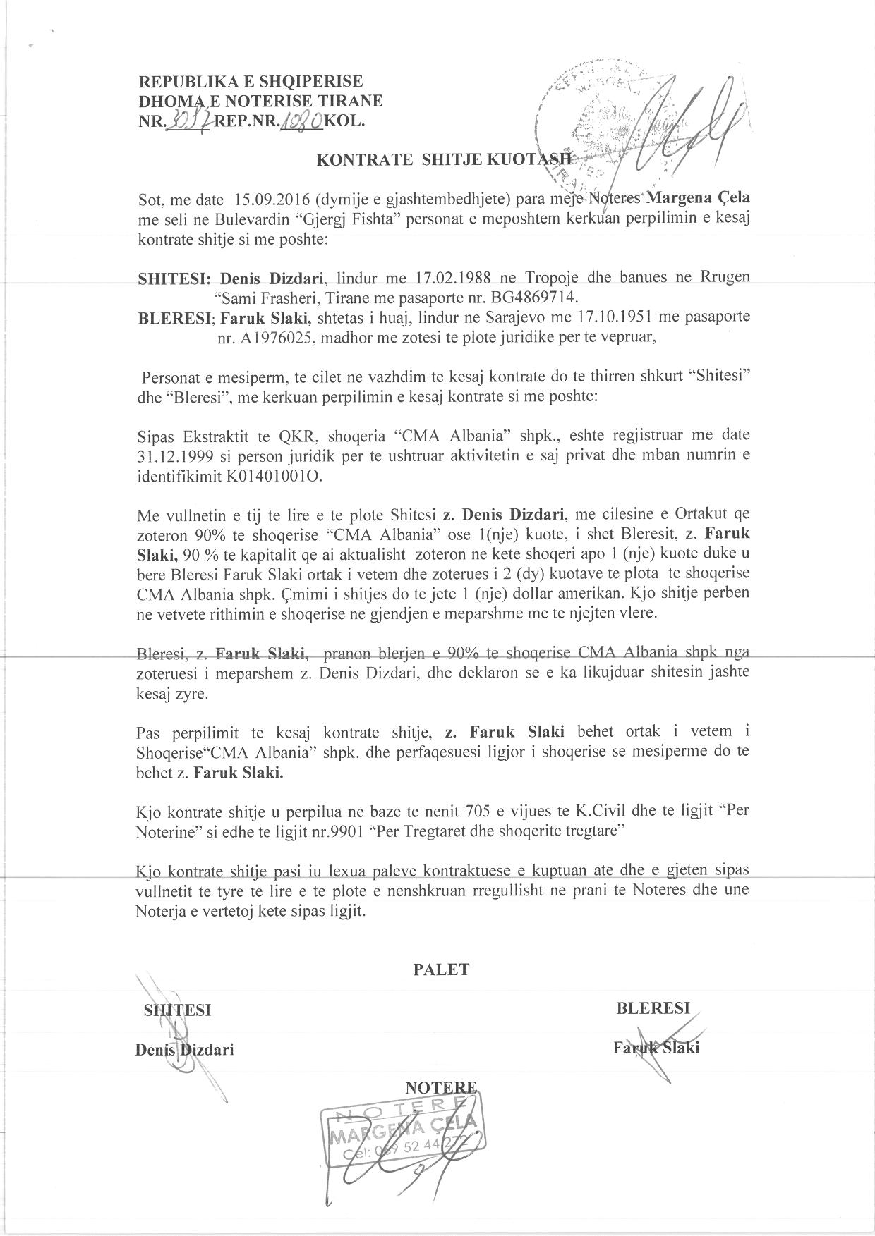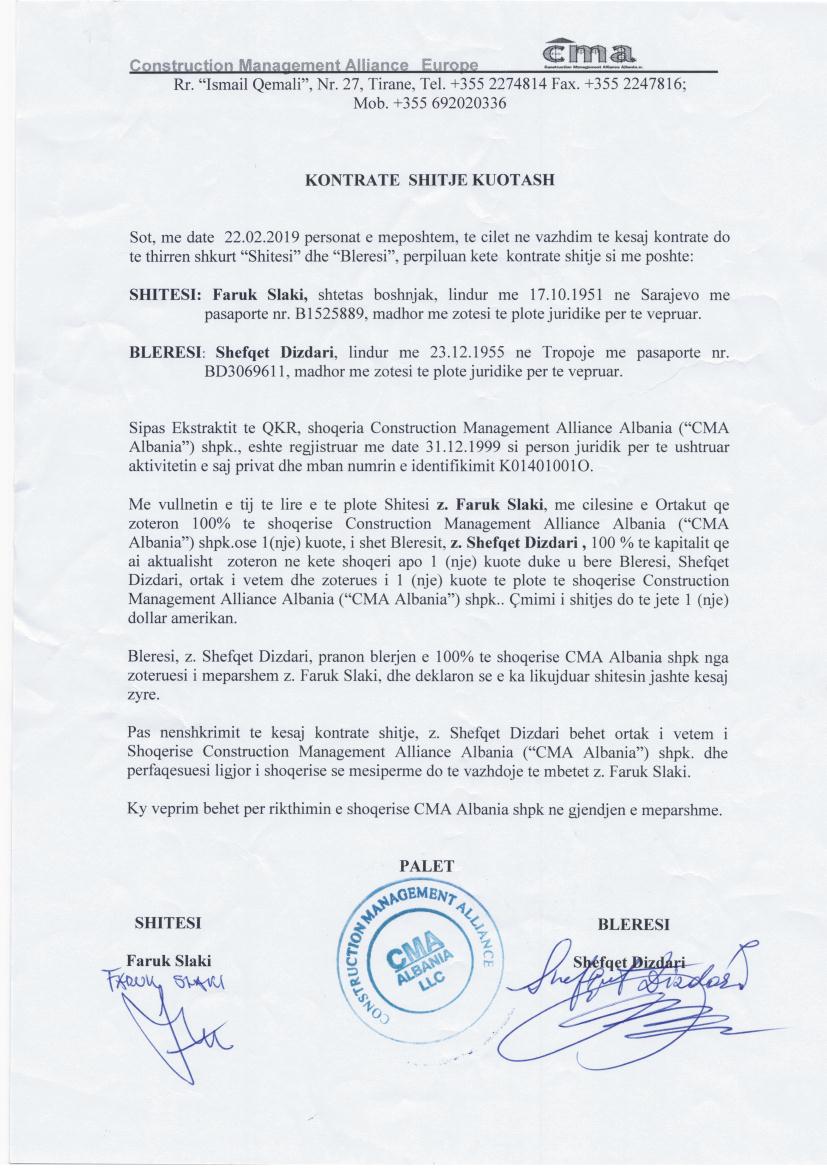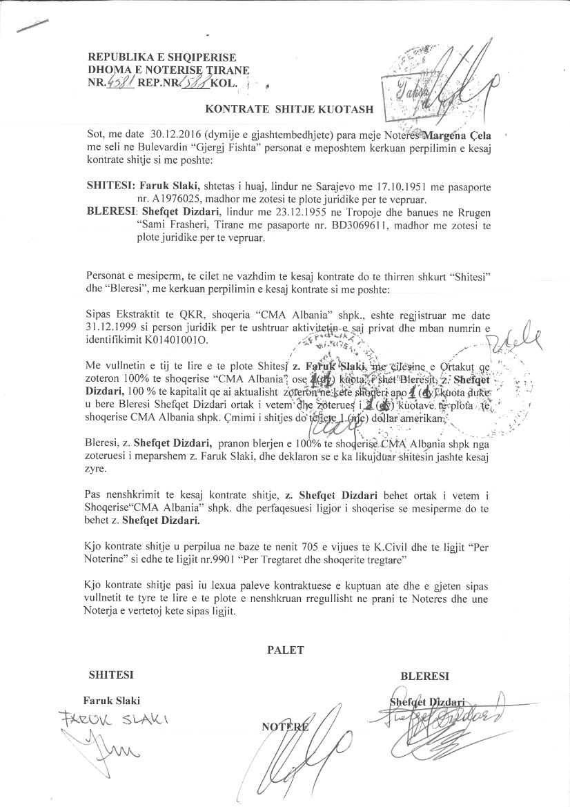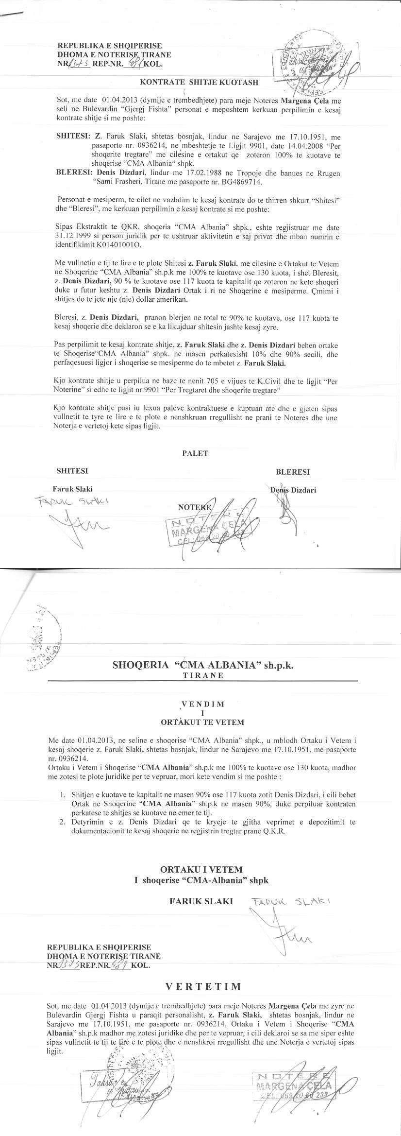 → Ekstrakti Historik i Regjistrit Tregtar date 25.01.2023 → Akt themelimi dhe Statuti i Shoqerise → Kontrate Shitje Kuotash date 30.01.2008 → Kontrate Shitje Kuotash date 01.04.2013 → Vendim i Asamblese se Ortakeve, Zmadhim Kapitali date 23.12.2014 → Kontrate Shitje Kuotash date 15.09.2016 → Kontrate Shitje Kuotash date 30.12.2016 → Kontrate Shitje Kuotash date 15.08.2018 → Kontrate Shitje Kuotash date 22.02.2019 |