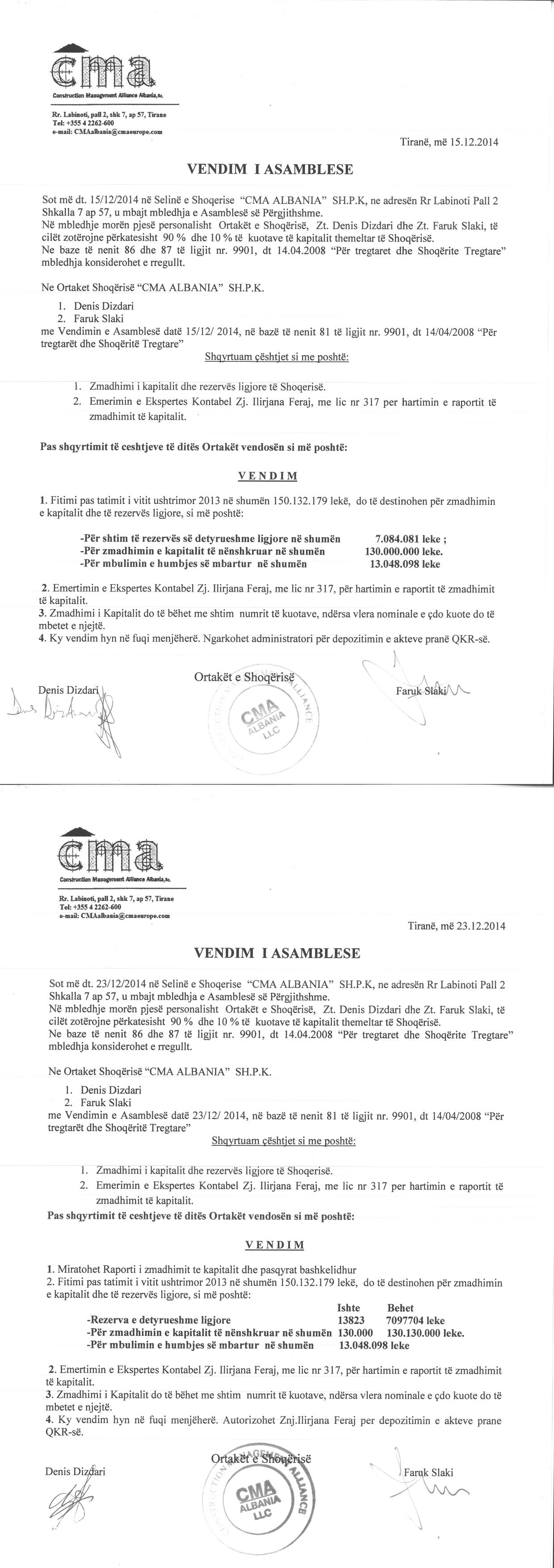 | Çështje Ligjore: | I. Me date 20/08/2014, me ane te Urdhërit Nr.262 Dosje, Nr. 262/3 Prot, date 13.08.2014, lëshuar nga “Shoqeria Permbarimore Gjyqesore 3H” sh.p.k, u urdherua te bllokohen kuotat dhe te drejtat qe rrjedhin nga zoterimi i kuotave per debitorin , shoqeria C M A ALBANIA sh.p.k pajisur me NUIS (NIPT) - K01401001O me perfaqesues Z. Faruk Slaki.” II. Me date 25/09/2014, me ane te urdhrit nr.262 dosje 262/14 prot. dt.18.09.2014, lëshuar nga Shoqëria Përmbarimore "3H", u urdherua heqja e sekuestros konservative vënë mbi Shoqërinë "CMA Albania" me NUIS (NIPT)-K01401001O dhe përfaqësues z.Faruk Slaki vendosur me shkresën nr.262/3 prot. dt.13.08.2014. |