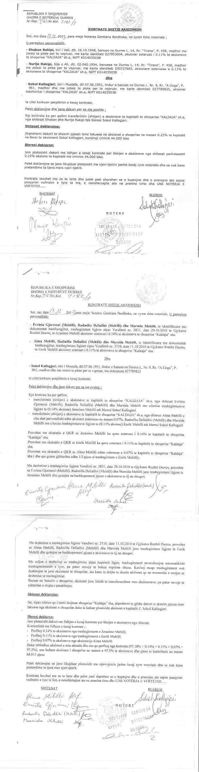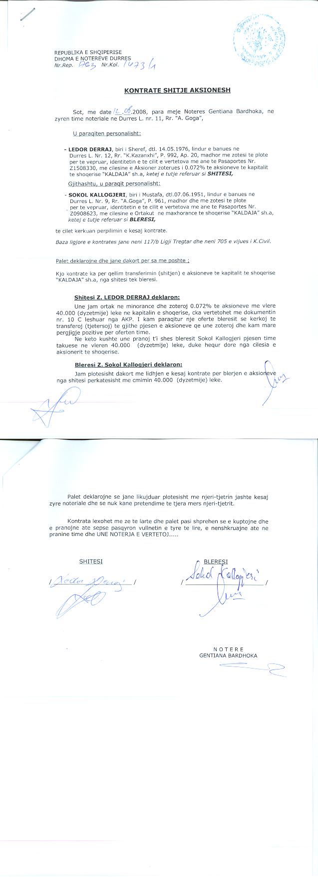 → Ekstrakt historik i regjistrit tregtar date 02.12.2021 → Akti i themelimit dhe statuti → Urdher per transferimin e aksioneve 15.05.2001 → Urdher per privatizimin me ankand 07.09.1999 → Kontrate shitblerje aksionesh 19.11.1992 → Kontrate shitblerje aksionesh 28.06.2006 → Urdher per privatizimin e aksioneve 24.05.2002 → Kontrate shitje aksionesh 12.08.2008 → Kontrate shitje aksionesh 12.12.2013 |