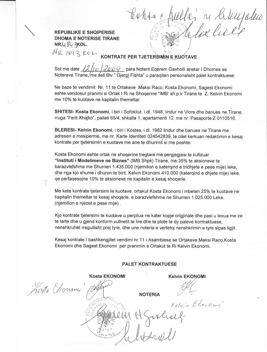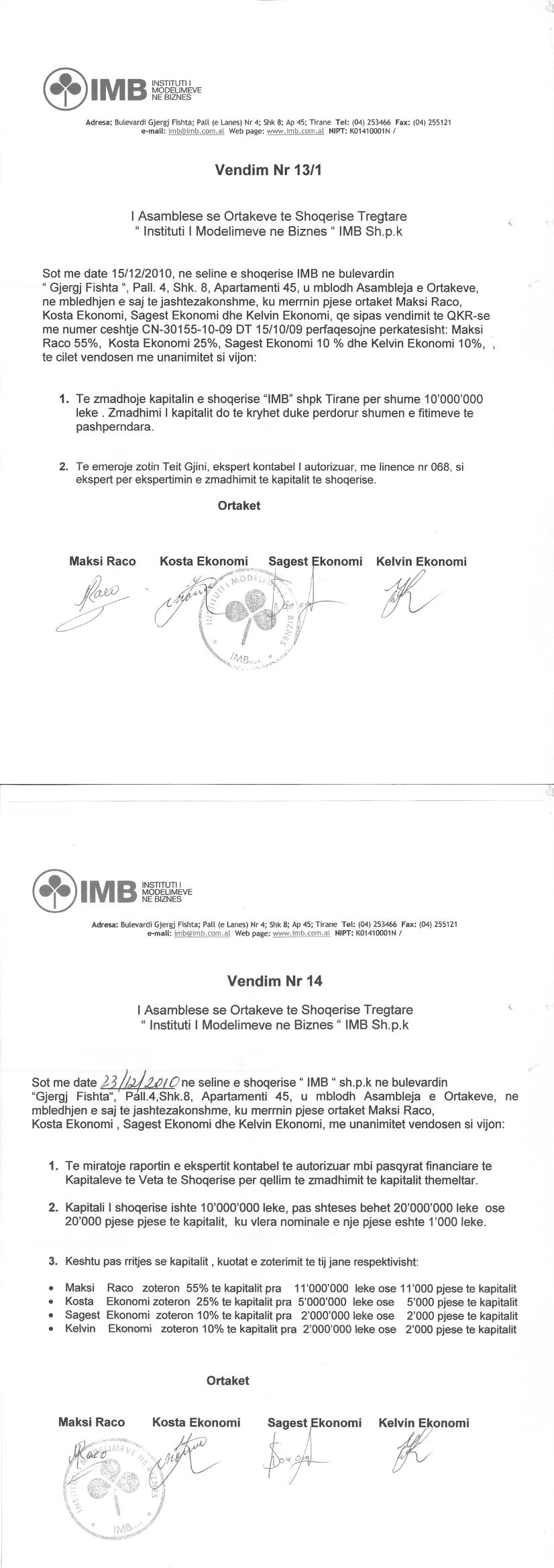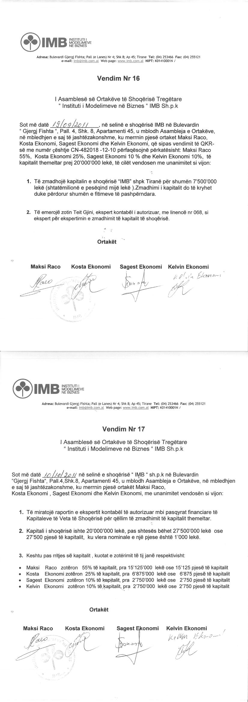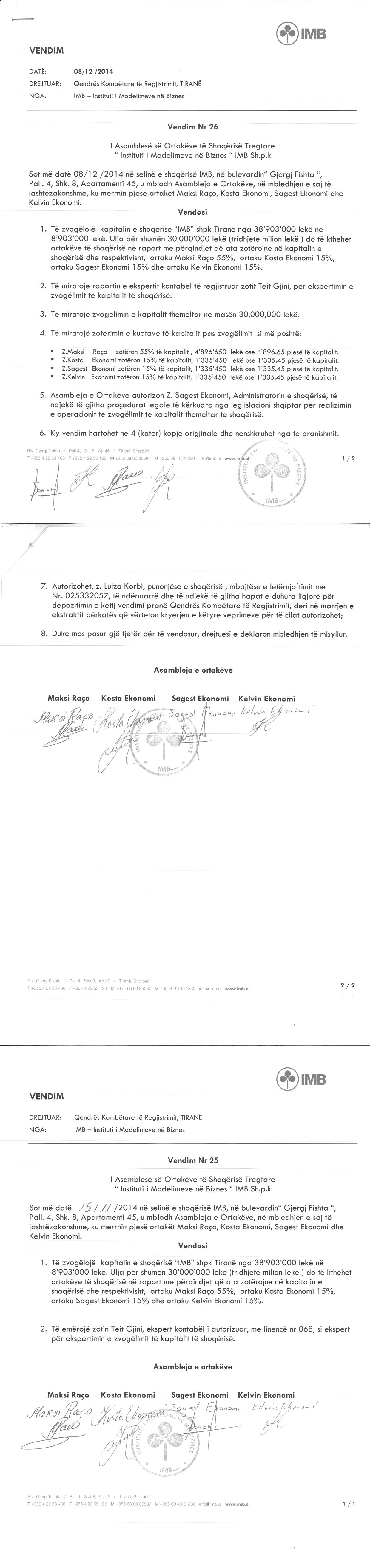 → Ekstrakt historik i regjistrit tregtar date 27.07.2022 → Akti i themelimit dhe statuti → Kontrate shitje kuotash date 26.12.2019 → Kontrate dhurimi kuotash date 06.10.2014 → Kontrate dhurimi kuotash 22.11.2019 → Kontrate per tjetersimin e kuotave date 15.09.2005 → Kontrate shitje 06.01.2000 → Kontrate shitje 30.08.2000 → Kontrate shitje 10.01.1998 → Kontrate per tjetersimin e kuotave date 12.10.2009 → Vendimi i asamblese se ortakeve per zmadhimin e kapitalit date 29.12.2009 → Vendim i asamblese se ortakeve per zmadhimin e kapitalit date 15.12.2010 → Vendimi i asamblese se ortakeve per zmadhimin e kapitalit date 19.09.2011 → Vendimi i asamblese se ortakeve per zmadhimin e kapitalit date 08.12.2014 → Vendimi i asamblese se ortakeve per zmadhimin e kapitalit date 27.06.2013 → Vendimi i asamblese se ortakeve per zvogelimin e kapitalit date 08.06.2022 |