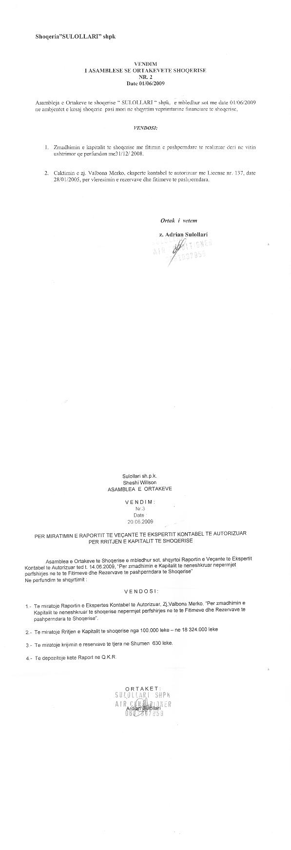 → Ekstrakt historik i regjistrit tregtar 21.10.2021 → Statuti dhe akti i themelimit → Vendimi i asamblese se ortakeve per zmadhimin e kapitalit 13.08.2018 → Vendim i ortakut te vetem per zmadhimin e kapitalit 18.12.2014 → Vendim i asamblese se ortakeve per zmadhimin e kapitalit 01.06.2009 → Ekstrakt Historik i Regjistrit Tregtar date 18.05.2023 → Ekstrakt Historik i Regjistrit Tregtar date 25.09.2024 |