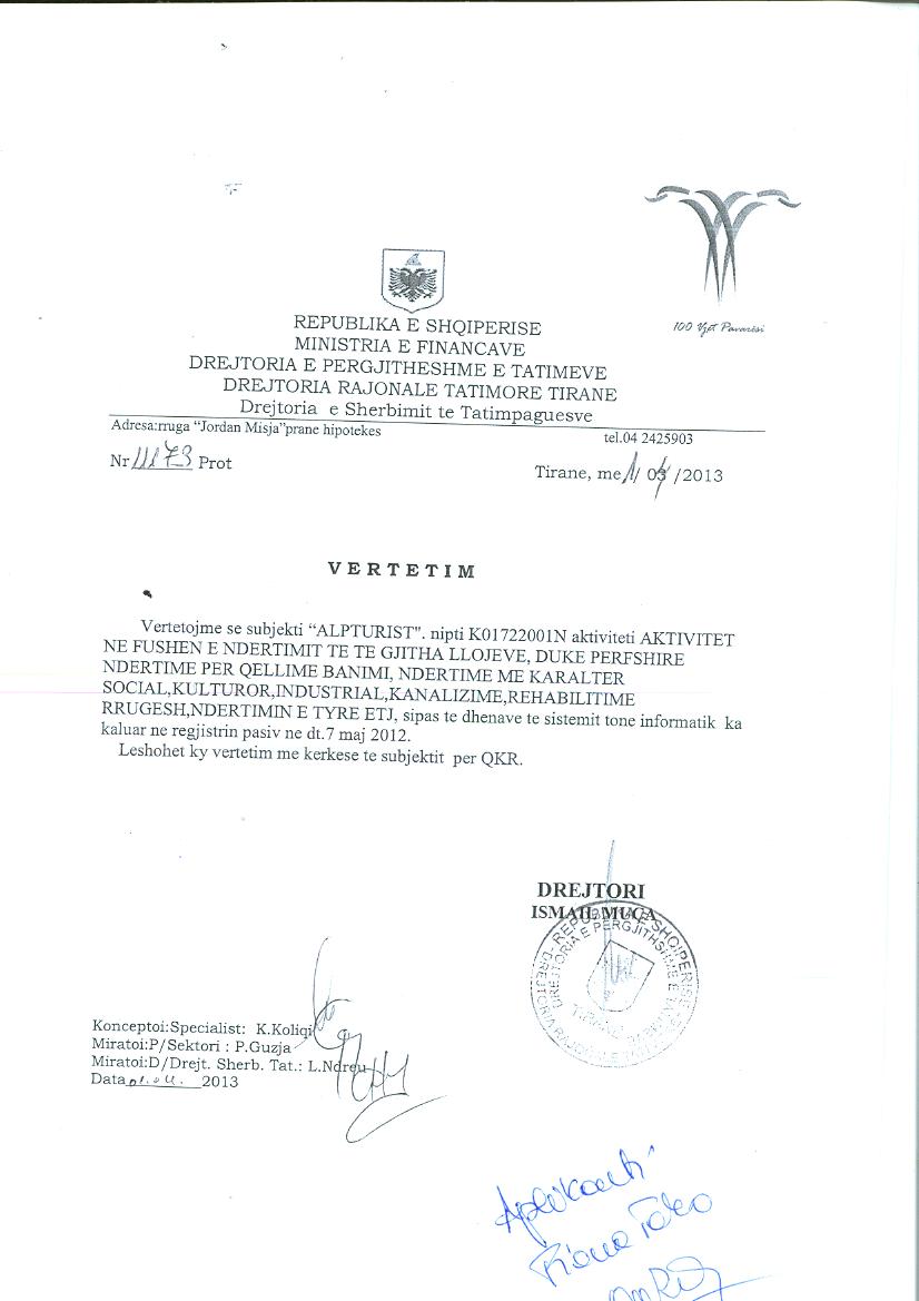 Statusi i shoqërisë ishte "Aktiv" u be "Pezulluar". II. Me datë 01.04.2013, me anë të vertetimit, Nr.11173 Prot, leshuar nga Drejtoria Rajonale Tatimore Tirane, ne te cilin konfirmohet kalimi ne statusin PASIV te subjektit " ALPTURIST" me date: 07.05.2012. Statusi i shoqërisë nga "Pezulluar" u bë "Pasiv". |