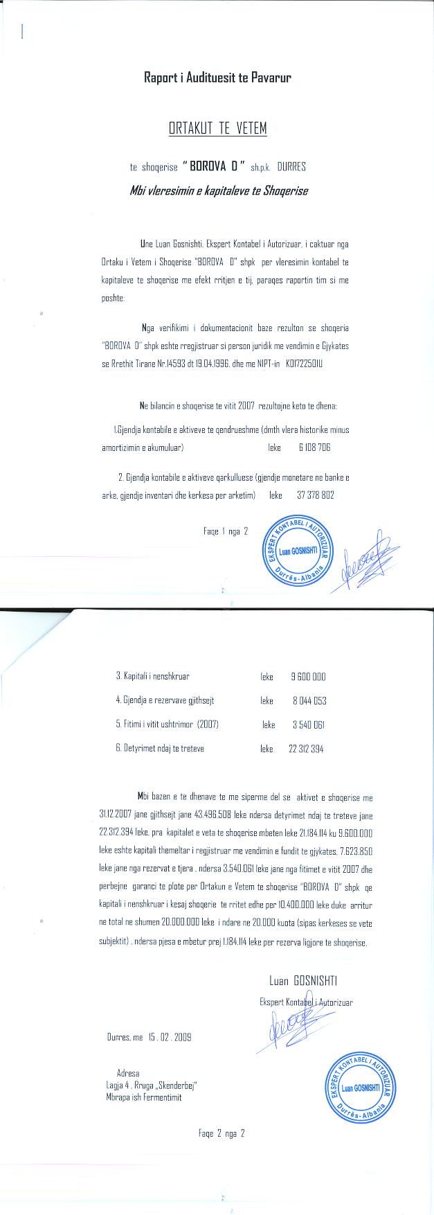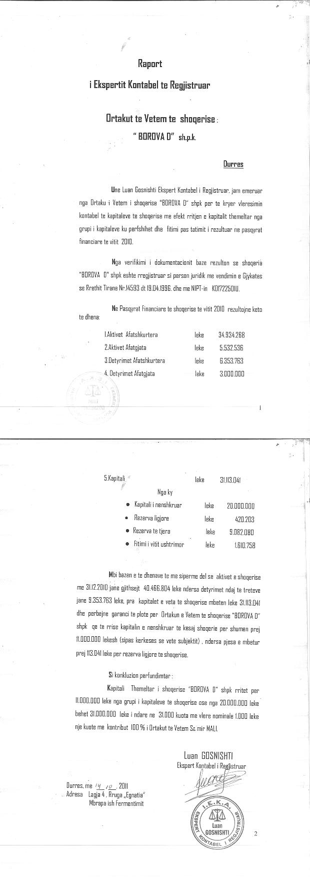 → Ekstrakt historik i regjistrit tregtar date 02.11.2021 → Akti i themelimit dhe statuti → Raporti i audituesit te pavarur date 15.02.2009 → Raporti i ekspertit kontabel per zmadhimin e kapitalit 14.10.2011 |