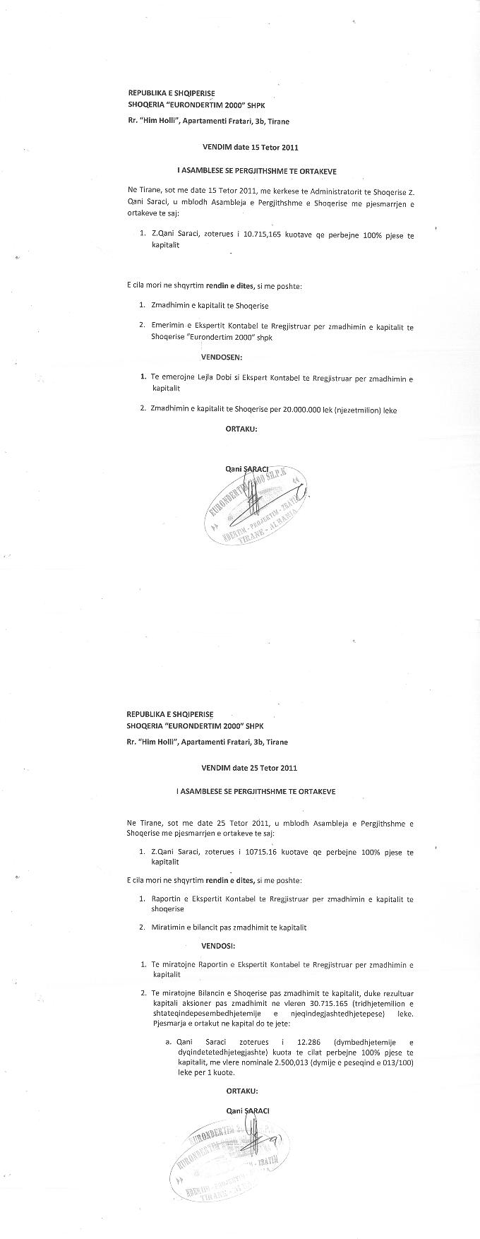 → Ekstrakt historik i regjistrit tregtar 08.06.2022 → Akti i themelimit → Vendim i asamblese se ortakeve per zvogelimin e kapitalit 23.09.2019 → Vendimi i asamblese se ortakeve per zmadhimin e kapitalit 15.10.2011 → Vendimi i ortakut te vetem per rritjen e kapitalit 10.09.2018 → Ekstrakti Historik i Regjistrit Tregtar date 11.04.2023 → Ekstrakti Historik i Regjistrit Tregtar date 17.05.2023 → Ekstrakt Historik i Regjistrit Tregtar date 10.08.2023 → Ekstrakt Historik i Regjistrit Tregtar date 05.12.2024 |