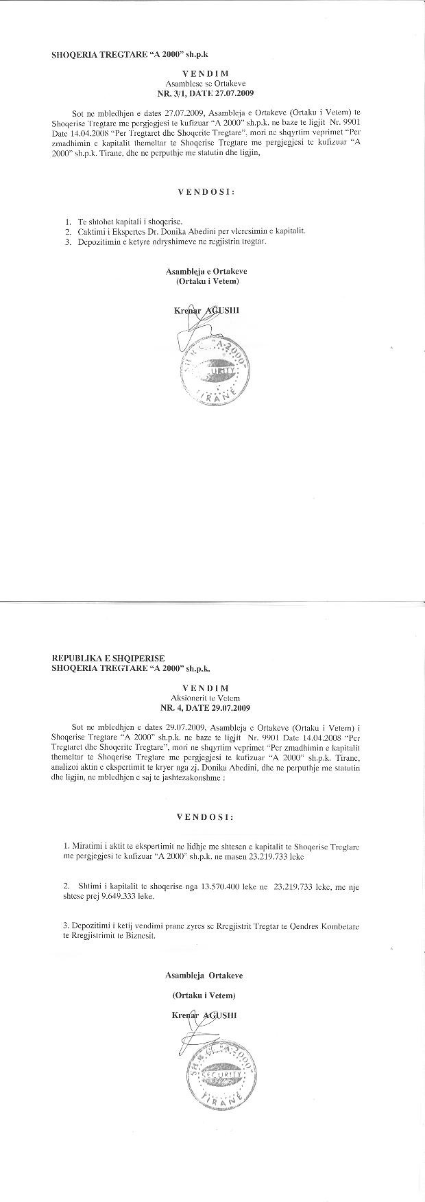 → Ekstrakti Historik i Regjistrit Tregtar date 07.12.2021 → Vendim i ortakut te vetëm per rritjen e kapitalit date 25.08.2014 → Vendim i ortakut te vetëm per rritjen e kapitalit date 29.07.2009 → Vendim i ortakut te vetëm per rritjen e kapitalit date 31.08.2018 → Vendim i ortakut te vetëm per zvogelimin e kapitalit date 15.06.2019 → Akti i themelimit dhe dokumenta te ndryshem |