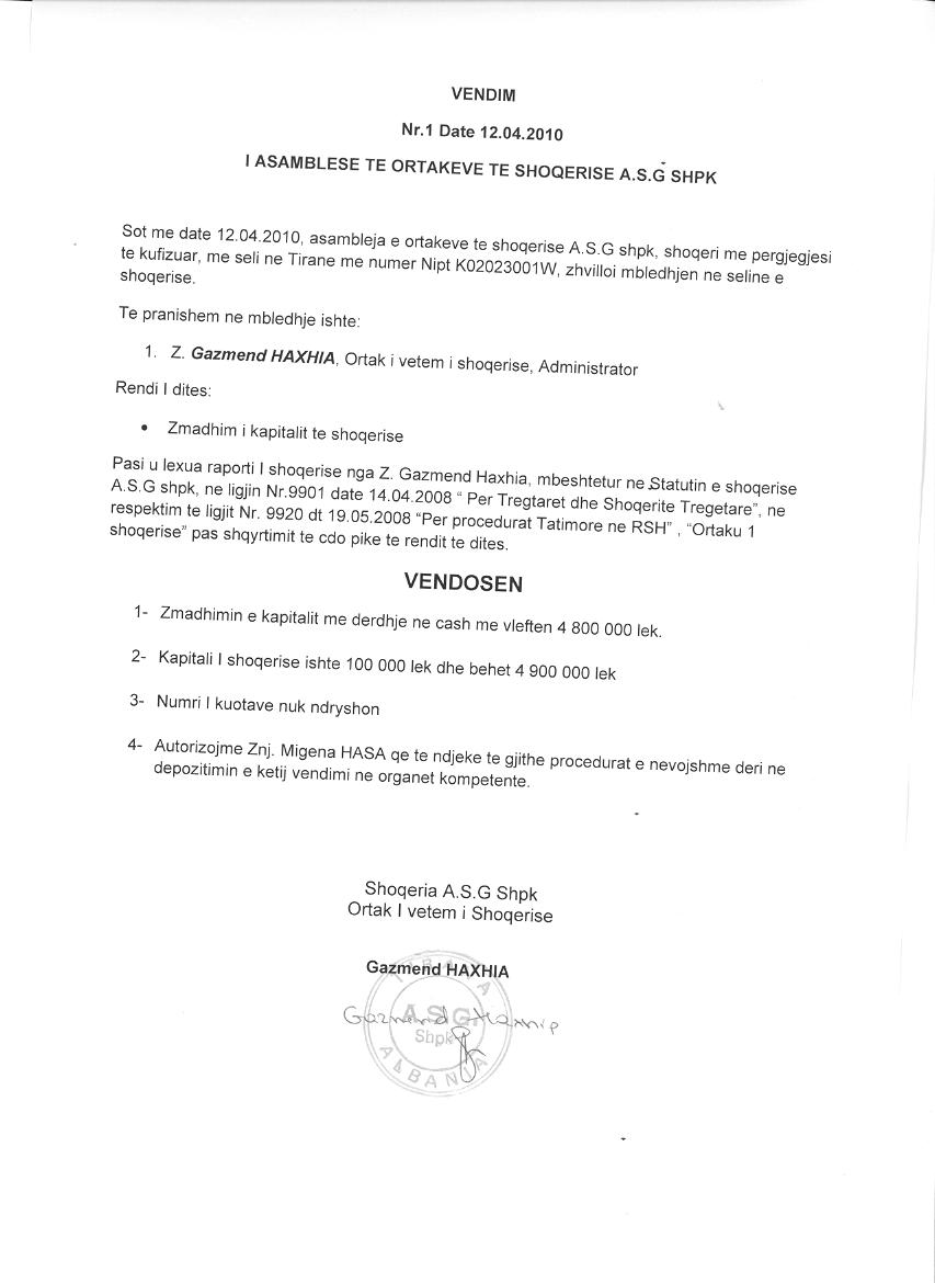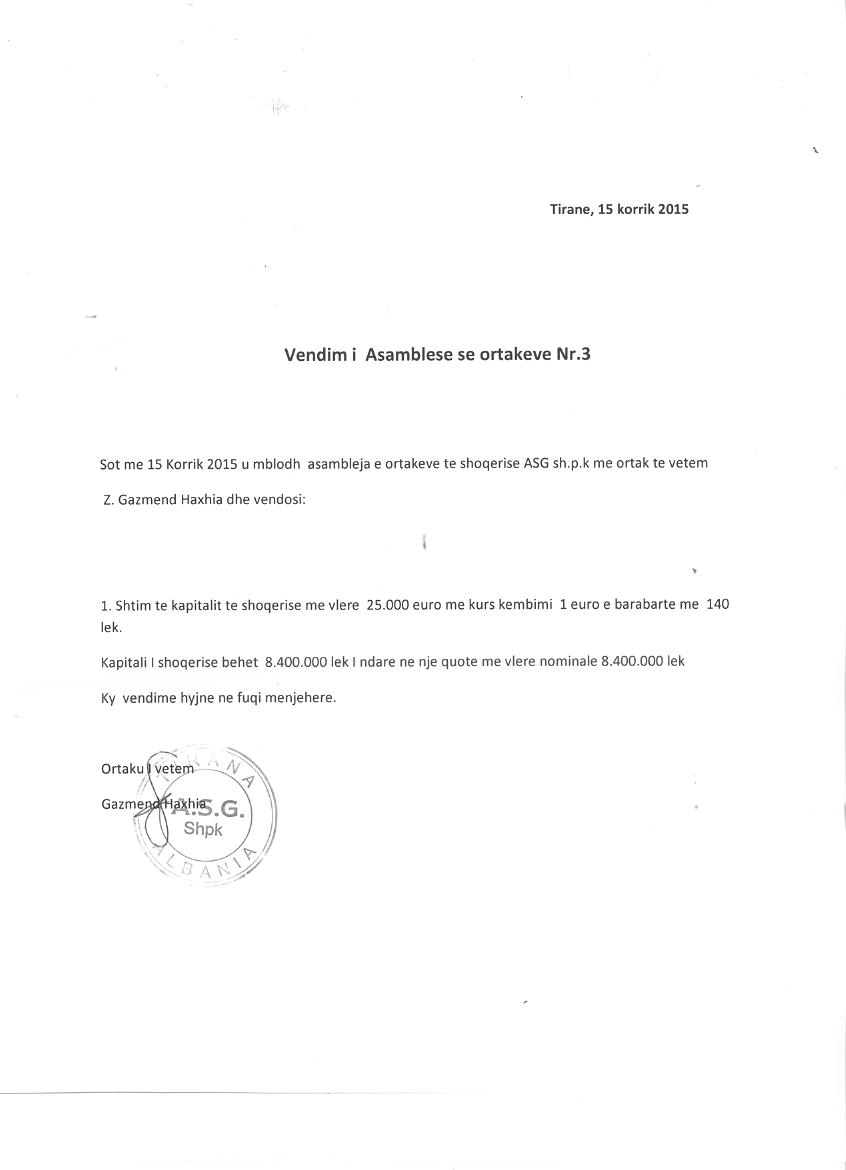 → Ekstrakti Historik i Regjistrit Tregtar date 06.07.2024 → Statuti i Shoqerise → Vendim i Asamblese se Pergjithshme per rritjen e kapitalit date 12.04.2010 → Vendim i Asamblese se Pergjithshme per rritjen e kapitalit date 15.07.2015 |