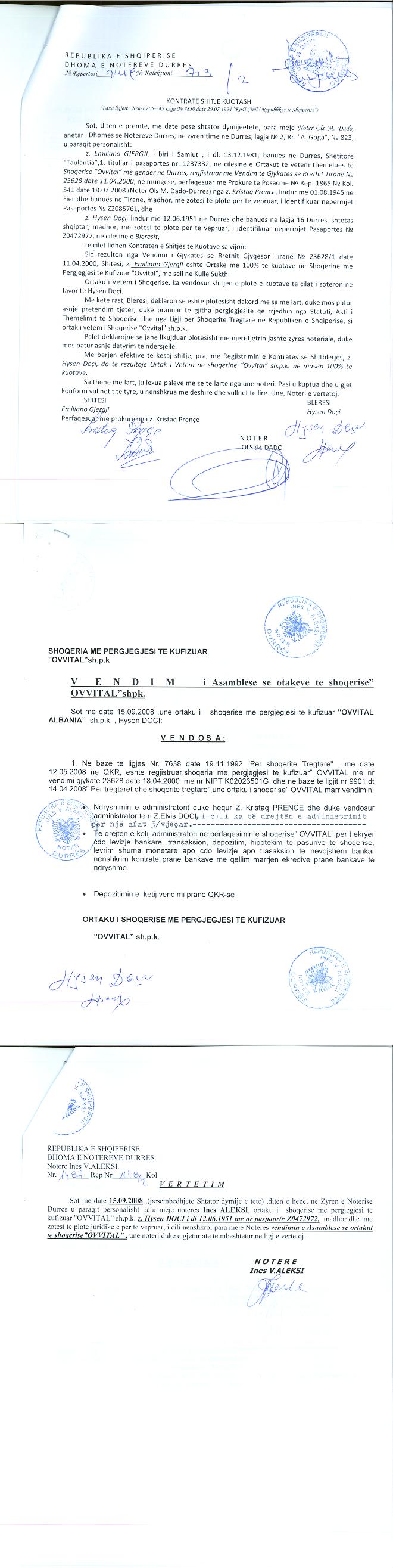 → Ekstrakt Historik i Regjistrit Tregtar date 04.06.2025 → Vendim per Regjistrimin e Personit Juridik → Vendim i Asamblese se Ortakeve te shoqerise date 18.05.2001 → Kontrate Shitje kuotash date 05.09.2008 → Vendim per zmadhimin e kapitalit date 22.08.2016 → Kontrate dhurimi kuotash kapitali date 02.11.2019 → Vendimi i Asamblese se ortakeve te shoqerise date 16.02.2024 |