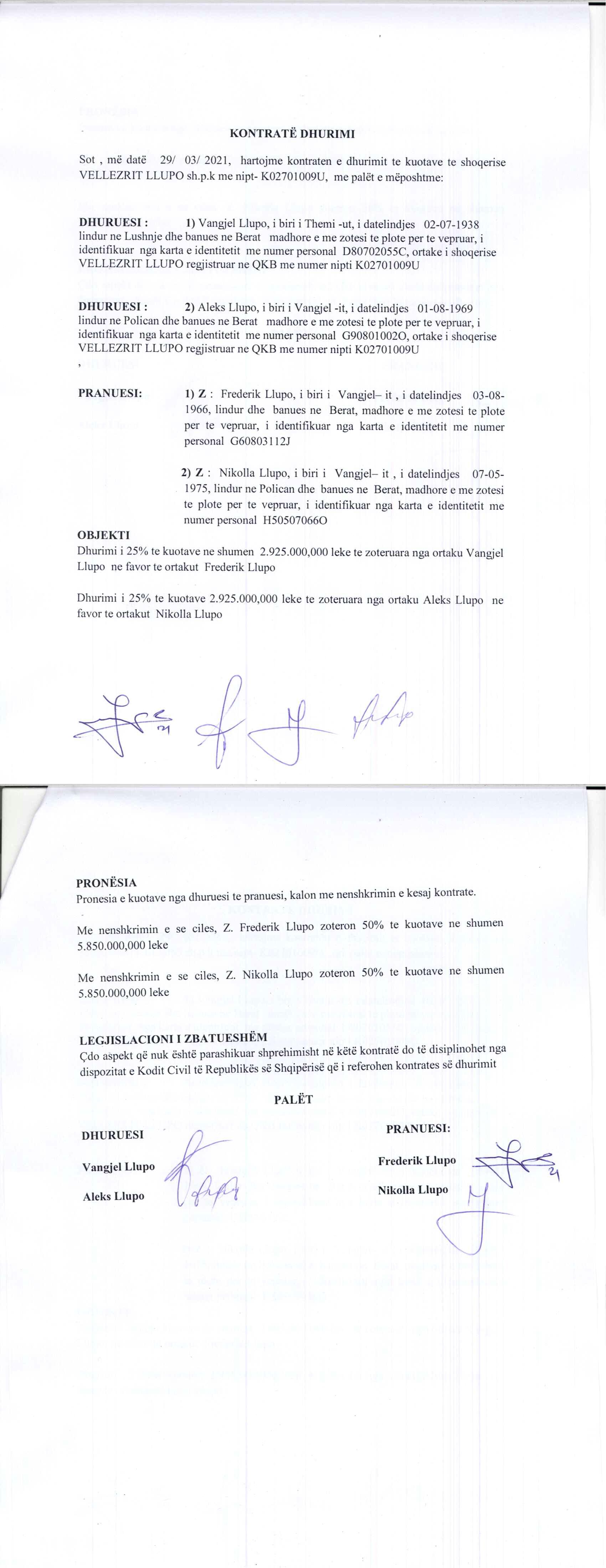 → Ekstrakt historik i regjistrit tregtar date 07.09.2021 → Akti i themelimit dhe statuti → Kontrate dhurimi kuotash date 29.03.2021 |