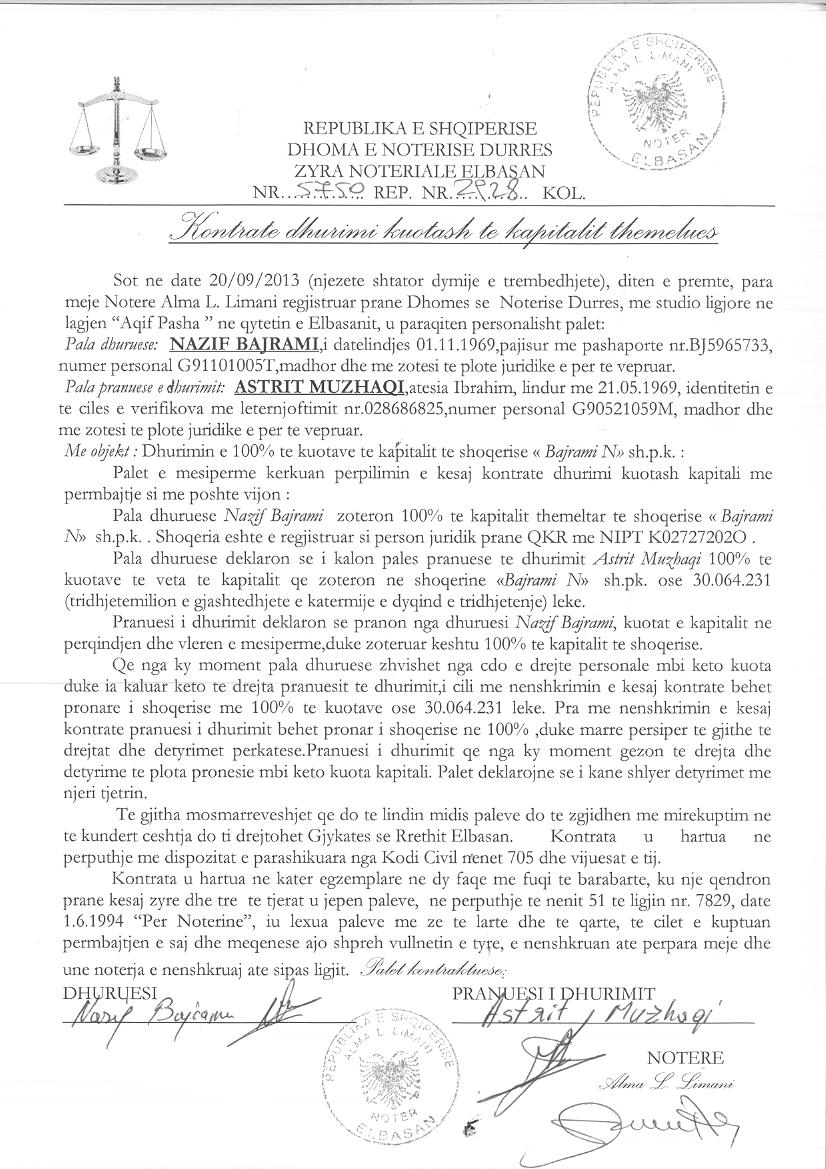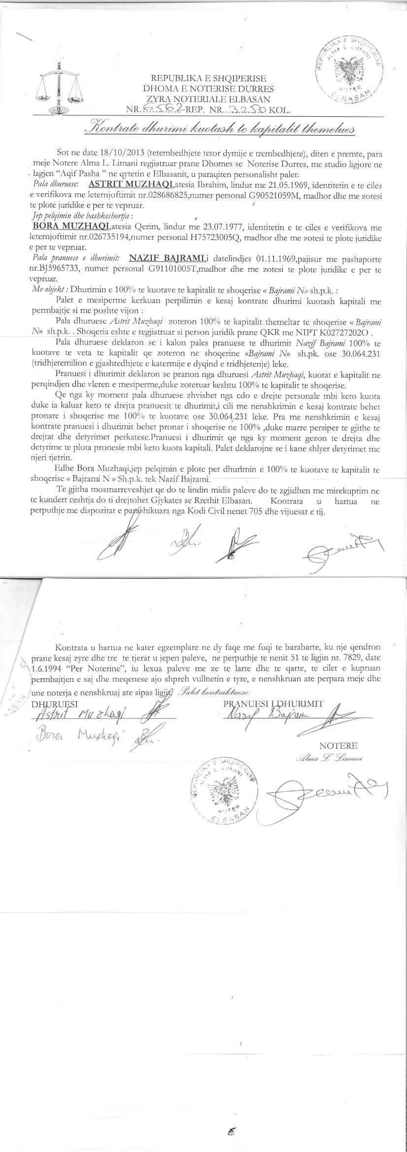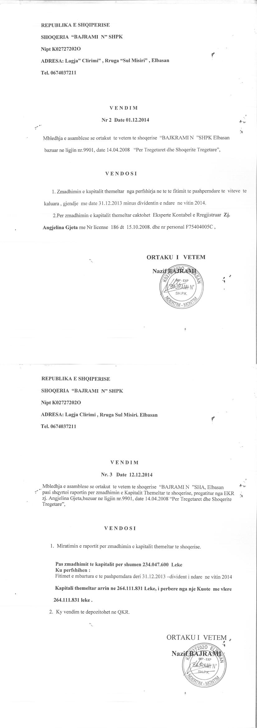 → Ekstrakt historik i regjistrit tregtar 08.06.2022 → Akti i themelimit te shoqerise → Kontrate dhurimi kuotash te kapitalit themelues 18.10.2013 → Kontrate dhurimi kuotash te kapitalit themelues 20.09.2013 → Vendimi per rritjen e kapitalit 01.12.2014 → Vendim i ortakut te vetem per zmadhimin e kapitalit 06.08.2020 → Vendim i ortakut te vetem per zmadhimin e kapitalit 10.10.2021 → Ekstrakti Historik i Regjistrit Tregtar date 06.04.2023 → Ekstrakt Historik i Regjistrit Tregtar date 10.08.2023 → Ekstrakt Historik i Regjistrit Tregtar date 24.09.2024 → Vendim i Ortakut të Vetëm, Zmadhim Kapitali datë 09.12.2023 → Urdhër për Vënien e Sekuestros datë 26.02.2024 → Urdhër për Vënien e Sekuestros datë 27.02.2024 → Urdhër për Heqjen e Sekuestros datë 09.04.2024 → Kontratë Dhurimi Kuotash datë 02.09.2024 → Ekstrakt Historik i Regjistrit Tregtar date 11.12.2024 → Vendimi i Ortakut te Vetem per zmadhimin e kapitalit date 30.11.2024 → Ekstrakt Historik i Regjistrit Tregtar date 10.04.2025 |