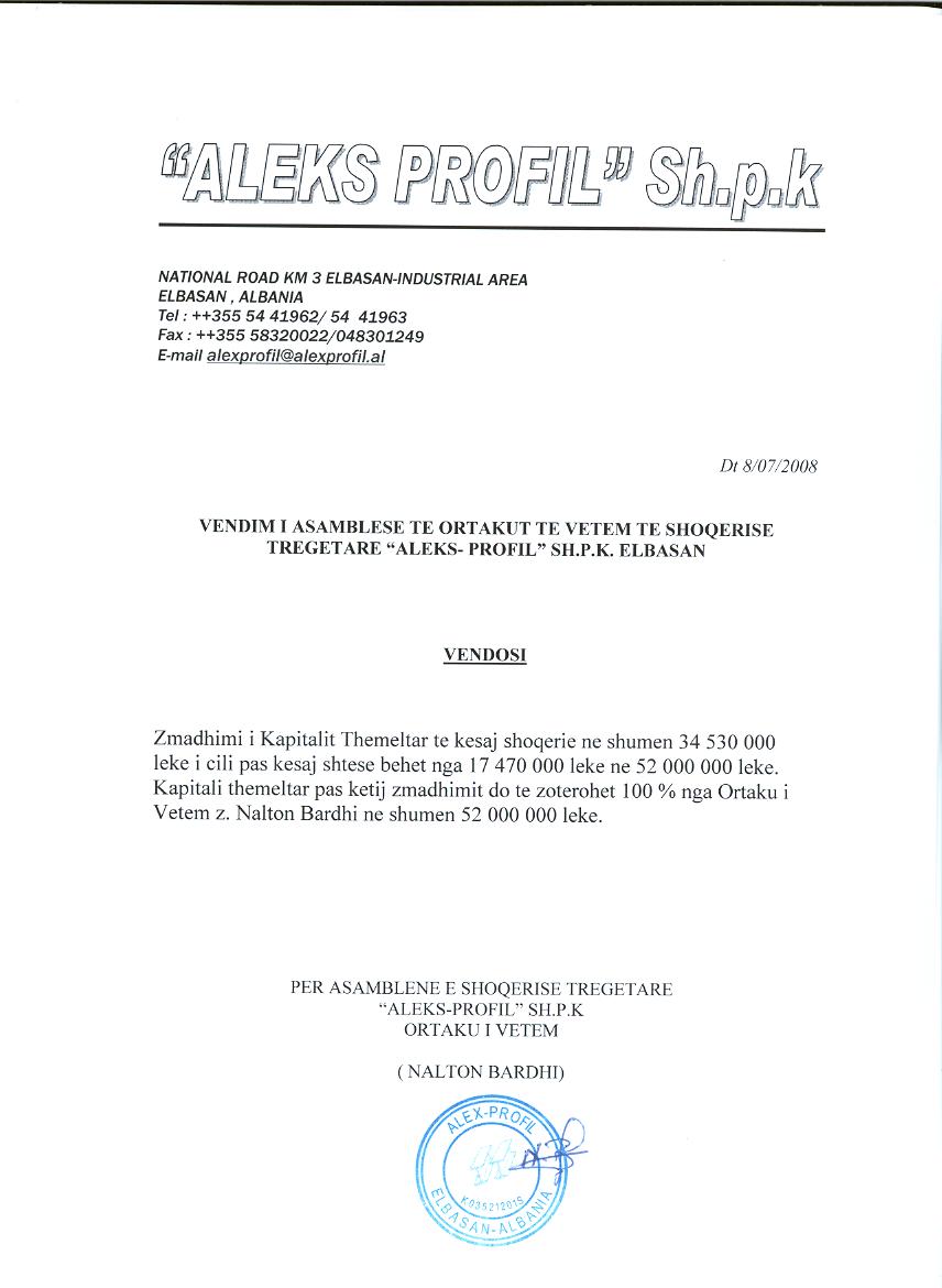 → Ekstrakt Historik i Regjistrit Tregtar date 16.05.2025 → Akt themelimi dhe Statuti i Shoqerise → Dokumente të Ndryshme → Vendimi i Ortakut të Vetëm për Zmadhimin e Kapitalit datë 13.04.2005 → Vendim i Ortakut të Vetëm për Zmadhimin e Kapitalit datë 08.07.2008 |