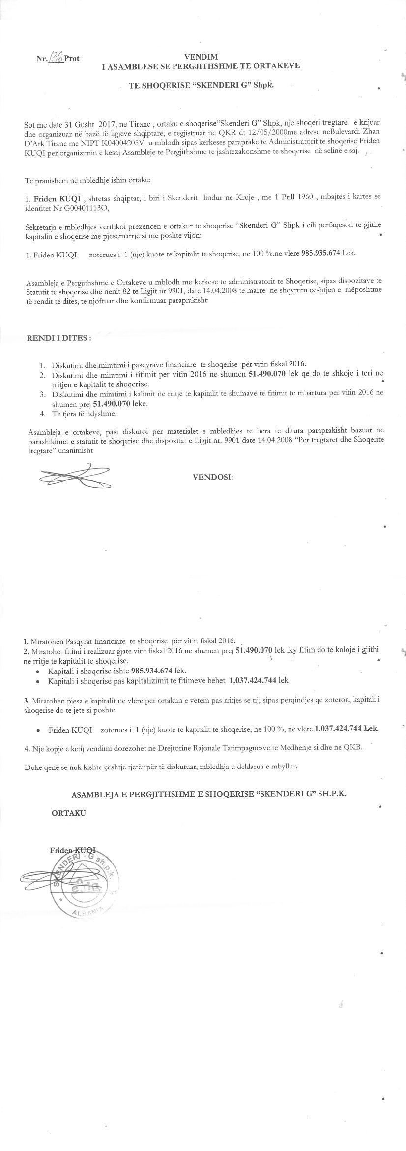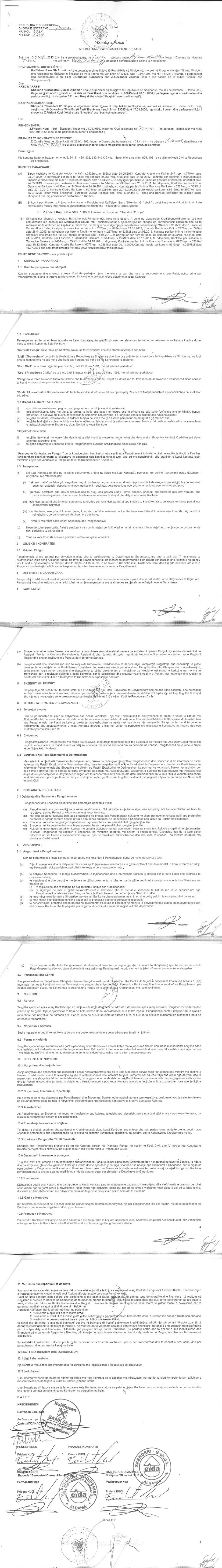 → Ekstrakt historik i regjistrit tregtar date 13.10.2023 → Akti i themelimit → Kontrate pengu date 04.09.2013 → Kontrate pengu date 31.12.2013 → Urdher per venien e sekuestros konservative date 02.06.2014 → Shkurtim Vendimi -Gykata Administrative e Shkalles se Pare Durres, date 04.11.2015 → Kontrate pengu date 09.09.2016 → Vendim i asamblese se ortakeve per zmadhimin e kapitalit date 31.08.2017 → Vendim per pushimin e ekzekutimit date 14.06.2018 → Vendim i asamblese se ortakeve per rritjen e kapitalit date 22.06.2018 → Urdher per vendosjen e sekuestros konservative date 17.12.2018 → Urdher per vendosjen e sekuestros konservative date 04.04.2019 → Urdher per venien e sekuestros konservative date 21.10.2021 → Vendim i asamblese se ortakeve per zmadhimin e kapitalit date 18.06.2022 → Ekstrakt Historik i Regjistrit Tregtar date 30.09.2024 |