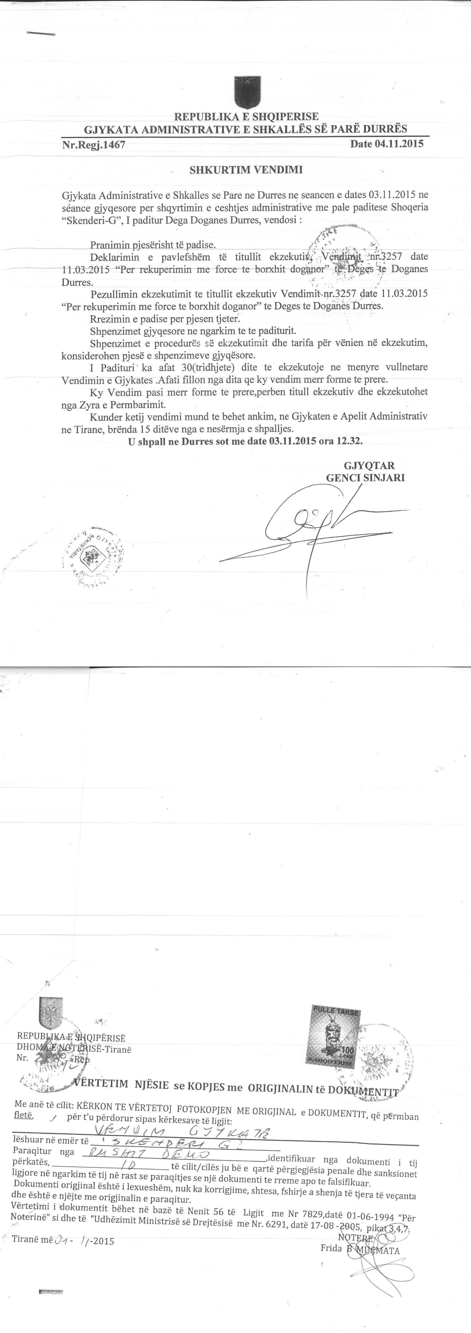 | Çështje Ligjore: | Me date 04.09.2013, u lidh Kontrata e Pengut Nr. 1369 Rep. Nr.3952 Kol, midis shoqerise SKENDERI G sh.p.k (Pengdhenes/Bashke kredimarres) dhe Raiffeisen Bank sh.a (Pengmarres /Kredidhenes) me objekt dhenien e aksioneve/ kuotave peng, te drejtave qe lidhen me to dhe cdo aksion/kuote e re e shoqerise ose te drejtat qe lidhen me to qe mund te zoterohen ne te ardhmen nga pengdhenesi do te jene garanci per shlyerjen e plote te kredise. Me date 31.12.2013, u lidh Kontrata e Pengut, date Nr. 2657 Rep., Nr.6153., Kol, midis Frident Kuqi (Pengdhenes), Raiffeisen Bank (Pengmarres/Kredidhenes) dhe shoqeria “Europetrol Durres Albani sh.a (Kredimarres), shoqeria “Skenderi G” sh.p.k (Bashkekredimarres). Sipas urdhërave Nr.1039 Prot., Nr.647/1 Dosje, datë 02.06.2014 lëshuar nga Shoqëria Përmbarimore Gjyqësore Private “TDR GROUP” sh.p.k, u urdherua vendosja e masës së sekuestros konservative mbi të gjitha aksionet e zotëruara nga debitori shoqëria “SKENDERI G” sh.p.k, pajisur me NUIS (NIPT) - K04004205V. Sipas urdhërave Nr.1039 Prot, Nr.647/1 Dosje, datë 02.06.2014 lëshuar nga Shoqëria Përmbarimore Gjyqësore Private “TDR GROUP” sh.p.k, u urdherua vendosja e masës së sekuestros konservative mbi të gjitha aksionet e zotëruara nga debitori shoqëria “SKENDERI G” sh.p.k, pajisur me NUIS (NIPT) - K04004205V. Sipas Urdhrit Nr. 1331 Prot., Nr. 677/1 Dosje, datë 07.07.2014, "Për Vënien e Sekuestros Konservative”, lëshuar nga Shoqëria Përmbarimore Gjyqësore Private “TDR GROUP” sh.p.k, drejtuar QKR, u urdherua vendosja e masës së sekuestros konservative mbi të gjitha aksionet e zotëruara nga debitori shoqëria “SKENDERI G” sh.p.k., me NUIS (NIPT) K04004205V Sipas urdhrit nr.1343 prot. 677/1 dosje dt.08.07.2014, lëshuar nga Shoqëria "TDR Group", u urdherua zhbllokimi nga masa e sekuestros konservative aksionet e Shoqërisë "Skenderi G" me NUIS (NIPT)- K04004205V, bllokuar me shkresën nr.1331 prot. dt.07.07.2014 Sipas shkreses Nr.1343 Prot., datë 08.07.2014, lëshuar nga Shoqëria Permbarimore Gjyqesore Private "TDR GROUP" sh.p.k., u urdherua QKR Tirane, te zhbllokoje nga masa e sekuestros konservative aksionet e shoqerise "Skenderi G" sh.p.k., me NUIS (NIPT) K04004205V, bllokuar me shkresen Nr.1331 Prot., date 07.07.2014 te Shoqëria Permbarimore Private "TDR GROUP". Me date 22.09.2014, u lidh Kontrata e Pengut mbi Kuotat e pjesemarrjes ne shoqeri Nr. Kol 3560, Nr. Rep 1556. Sipas Urdhrit Nr. 2412 Prot., Nr. 754/1 Dosje, datë 31.10.2014, "Për Vënien e Sekuestros Konservative”, lëshuar nga Shoqëria Përmbarimore Gjyqësore Private “TDR GROUP” sh.p.k, drejtuar QKR, u urdherua vendosja sekuestros konservative mbi te gjitha aksionet e zotëruara nga shoqëria “SKENDERI G” sh.p.k., me NUIS (NIPT) K04004205V dhe z.Frident Kuqi, në cilësinë e administratorit të shoqërisë”. Sipas shkreses Nr. 2448 Prot., Nr. 754/1 Dosje, datë 05.11.2014, lëshuar nga Shoqëria Përmbarimore Gjyqësore Private “TDR GROUP” sh.p.k, drejtuar QKR, u urdherua zhbllokimi I mases së sekuestros conservative aksionet e shoqerise “SKENDERI G” sh.p.k., me NUIS (NIPT) K04004205V e bllokuar me shkresen Nr. 2412 Prot., datë 31.10.2014.” Sipas Urdhrit Nr. 2483 Prot., Nr. 751/1 Dosje, datë 07.11.2014, "Për Vënien e Sekuestros Konservative”, lëshuar nga Shoqëria Përmbarimore Gjyqësore Private “TDR GROUP” sh.p.k, drejtuar QKR, u urdherua vendosja e masës së sekuestros konservative mbi te gjitha aksionet e zotëruara nga shoqëria “SKENDERI G” sh.p.k., me NUIS (NIPT) K04004205V dhe z.Frident Kuqi, në cilësinë e administratorit të shoqërisë”. Sipas Urdhrit Nr.2570 Prot., Nr.751/1 Dosje, datë 19.11.2014, "Për Pushimin e Ekzekutimit”, lëshuar nga Shoqëria Përmbarimore Private “TDR GROUP”, drejtuar QKR, u urdherua zhbllokimi nga masa e sekuestros konservative menjëherë aksionet e shoqërisë “SKENDERI G” sh.p.k, me NIPT K04004205V, bllokuar me shkresën Nr.2483 Prot, datë 07.11.2014, të Shoqërisë Përmbarimore Private “TDR Group”. Sipas Urdherit Nr. 2545 Prot., Nr. 753/1 Dosje, datë 14.11.2014, "Për Vënien e Sekuestros Konservative”, lëshuar nga Shoqëria Përmbarimore Gjyqësore Private “TDR GROUP” sh.p.k, drejtuar QKR, u urdherua vendosja e masës së sekuestros konservative mbi te gjitha aksionet e zotëruara nga debitori, shoqëria “SKENDERI G” sh.p.k., me NUIS (NIPT) K04004205V. Sipas Urdhërit Nr.2584 Prot., Nr.753/1 Dosje., datë 20.11.2014, lëshuar nga Shoqëria Përmbarimore “TDR GROUP” sh.p.k., u urdherua zhbllokimi nga masa e sekuestros konservative menjehere aksionet e shoqerise “SKENDERI G ” sh.p.k, me NUIS ( NIPT ) – K04004205V bllokuar me shkresen Nr.2545 Prot. Date 14.11.2014 te shoqerise permbarimore private “TDR GROUP”. Me date 23.06.2015, u lidh Kontrata e Pengut “Mbi kuotat e pjesëmarrjes në shoqëri” Nr. 2489 Rep., Nr. 1339 Kol, e lidhur midis shoqërisë “Europetrol Durrës Albania” sha (Kredimarrës) dhe Raiffeisen Bank sh.a (Pengmarrës/ Kredidhënës), bashkëkredimarrës shoqëria “Skenderi G” shpk, pengdhënës Frident Kuqi, pranues të kontratës së pengut Zamira Kuqi, me objekt krijimin e një pengu, ku me anën e të cilit, në mënyrë të pakthyeshme, japin peng Aksionet/ Kuotat, në favor të kredidhënësit, në mënyrë të pakthyeshme bien dakort për dhënien dhe krijimin e një pengu mbi kuotat e pjesëmarrjes në shoqëri dhe të drejtat e lidhura mbi to në favor të kredidhënësit Raiffeisen Bank sha.a dhe çdo aksion/ kuote e re e shoqërisë ose të drejtat që lidhen me to që mund të zotërohen në të ardhmen nga pengdhënësit. Sipas Urdhërit Nr.1673 Prot, datë 26.6.2015, "Për Vënien e Sekuestros Konservative”, lëshuar nga Shoqëria Përmbarimore"TDR GROUP", drejtuar QKR, u urdherua vendosja e masës sekuestro konservative mbi te gjitha aksionet e zoteruara nga shoqeria "SKENDERI G" Shpk