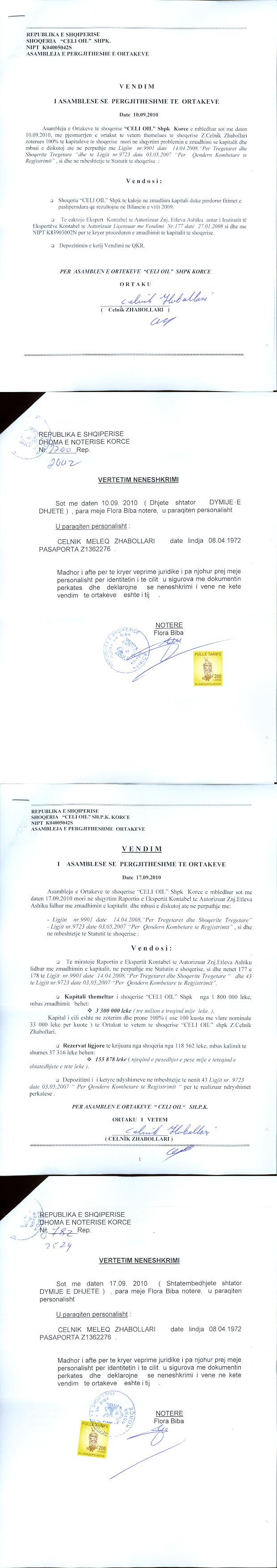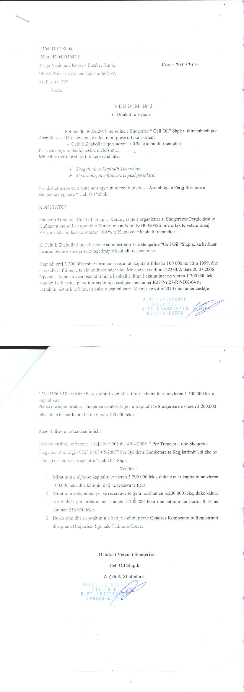 → Ekstrakt Historik i Regjistrit Tregtar date 02.06.2023 → Akt themelimi dhe Statuti i Shoqerise → Vendim i Ortakut te Vetem, Zmadhim Kapitali date 11.07.2006 → Vendim i Ortakut te Vetem, Zmadhim Kapitali date 17.09.2010 → Vendim i Ortakut te Vetem, Zvogelim Kapitali date 30.09.2019 |
