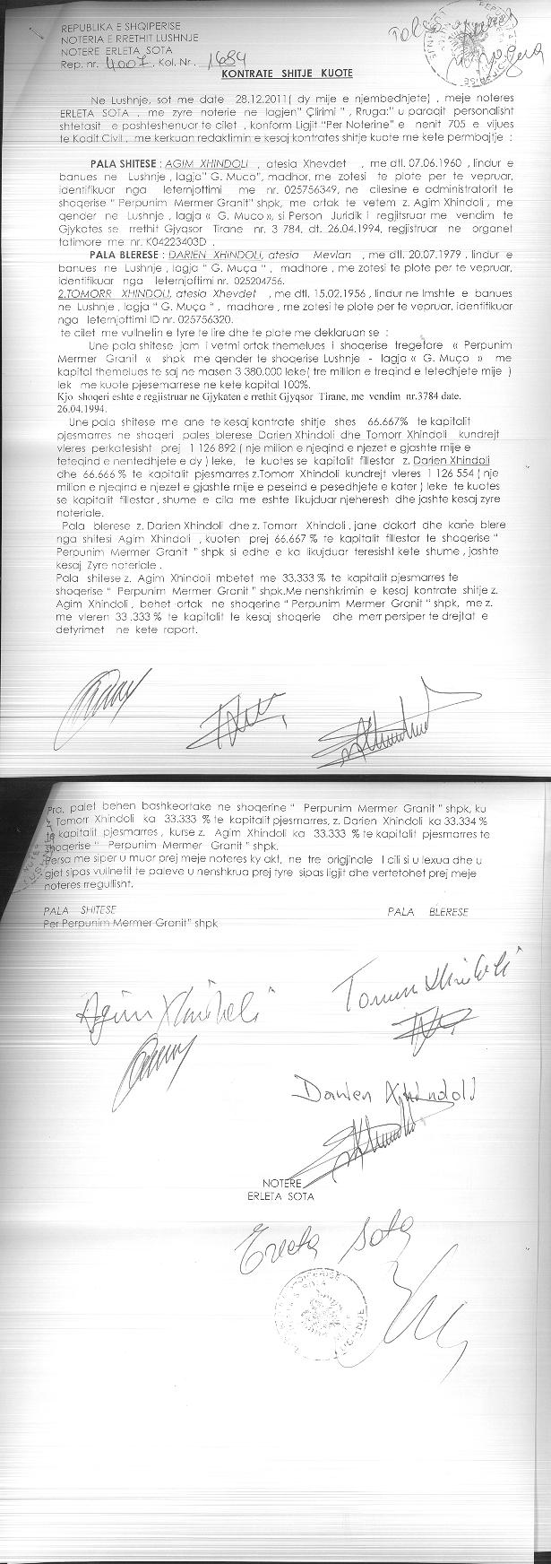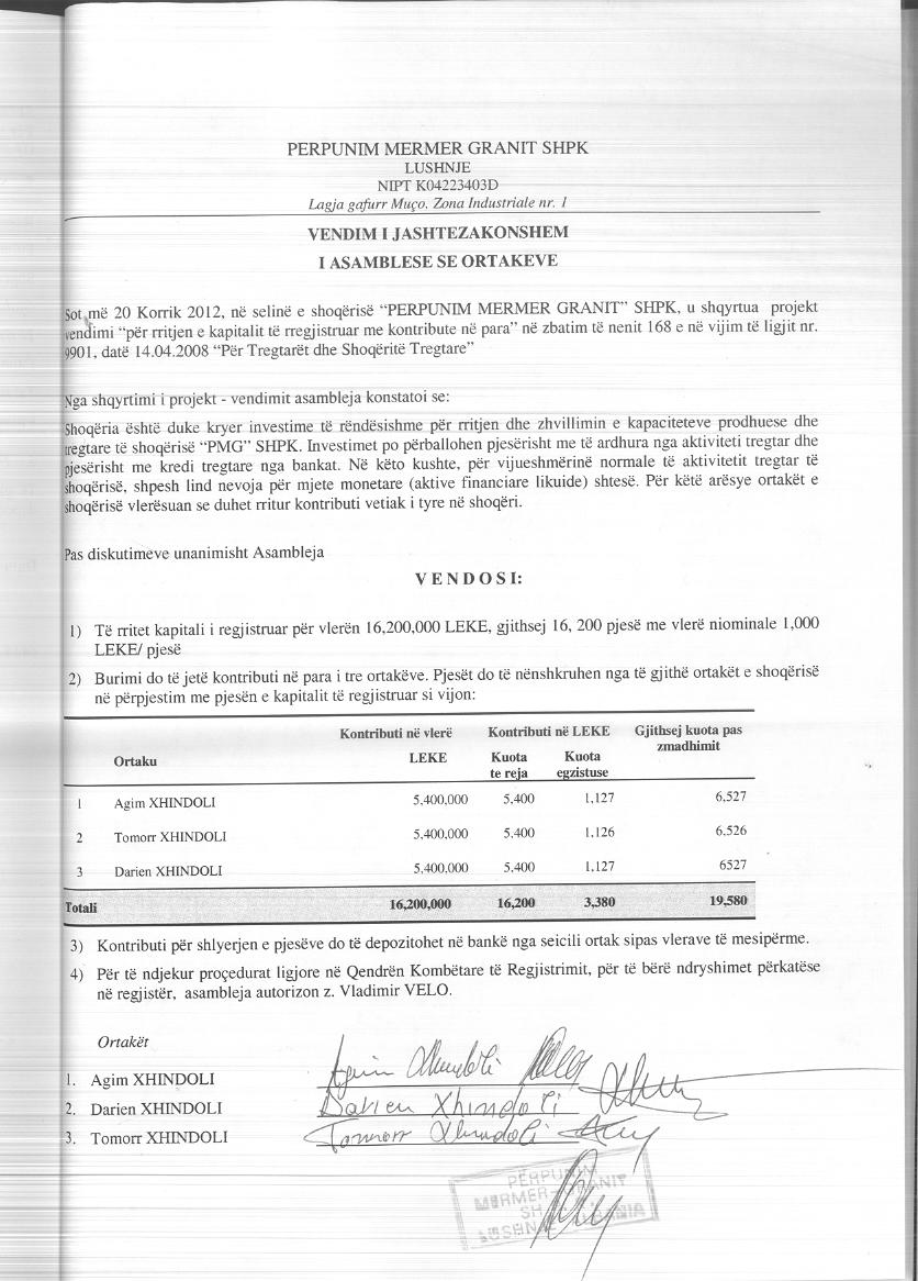 → Ekstrakt historik i regjistrit tregtar date 27.07.2021 → Kontrate shitje kuote date 28.12.2011 → Vendim i asamblese se ortakeve per zmadhimin e kapitalit date 20.07.2012 → Ekstrakt Historik i Regjistrit Tregtar date 01.12.2025 → Vendim Nr. 01, datë 26.03.2025 Për Miratimin e Lejes së Ndërtimi Për Objektin: "Ndërtimi i Godinës për DRSHTRR Fier – Dega Lushnje, Kapanon 1 Dhe 2 Kat për Kontrollin Fizik dhe Teknik” me Vendndodhje në Bashkinë Lushnje |