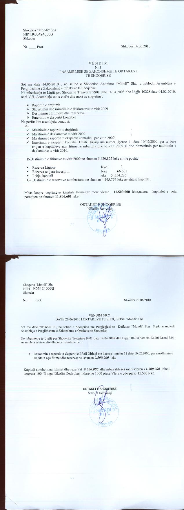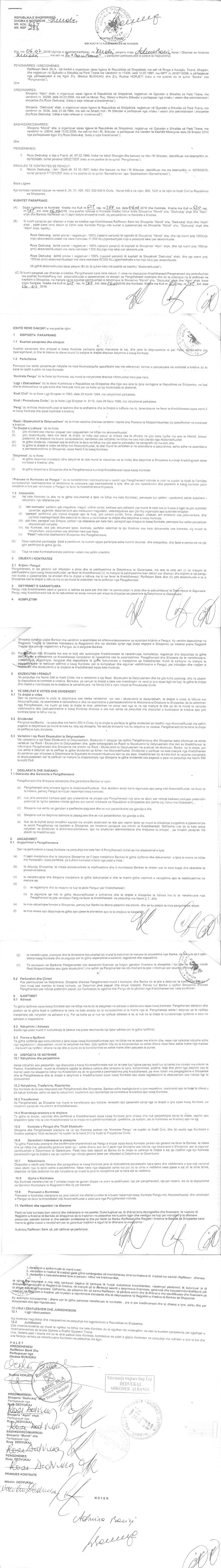 → Ekstrakt Historik i Regjistrit Tregtar date 06.06.2023 → Akt themelimi dhe Statuti i Shoqerise → Vendim i Aksionerit te Vetem, Zmadhim Kapitali date 20.06.2010 → Kontrate Dhurimi Aksionesh date 13.11.2013 → Kontrate Pengu date 19.11.2014 → Urdher per Venie Sekuestro date 31.05.2016 → Urdher per Heqje Sekuestro date 24.06.2016 → Kontrate Pengu date 06.07.2016 → Urdher per Venie Sekuestro date 13.08.2018 → Urdher per Heqje Sekuestro date 30.10.2018 → Marreveshje Siguruese date 01.10.2020 → Marreveshje Siguruese date 18.03.2021 |