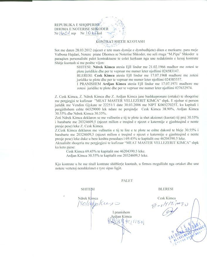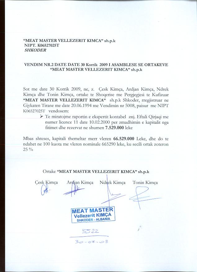 | Shoqëri e Kontrolluar nga ky Subjekt: | VMK, shoqeri me pergjegjesi te kufizuar e themeluar me 12/03/2009 ne Shkoder, Bushat, Plezhe, 500 m nga rruga Nacionale Shkoder Tirane me NIPT K96624002B me administrator Klaudio Kimça. Ortaket e shoqerise jane : shoqeria MEAT MASTER me 70% te kapitalit; shoqeria hollandeze Vaex Varkens-en Veehandel B.V me 25% te kapitalit dhe shoqeria hollandeze KBAgro me 5% te kapitalit. Sipas te dhenave te QKB deri me date 26.07.2022 |