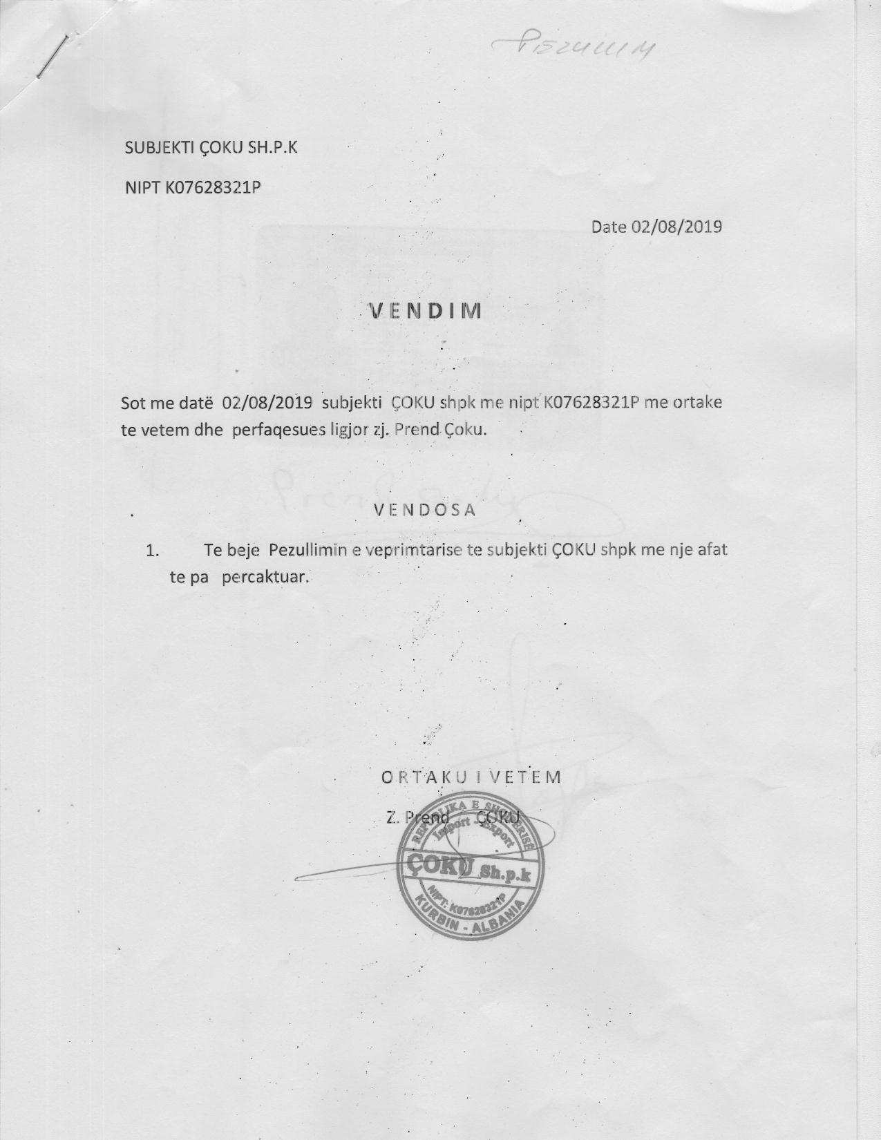 → Ekstrakt historik i regjistrit tregtar date 30.12.2021 → Vendim per pezullimin e veprimtarise se shoqerise date 02.08.2019 → Vendimi per pezullimin e aktivitetit date 26.12.2018 |