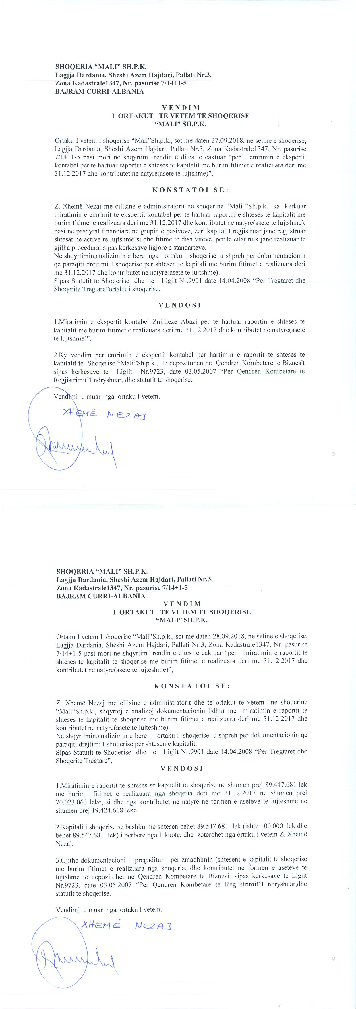 → Ekstrakti Historik i Regjistrit Tregtar date 24.11.2021 → Statusi fillestar dhe Kontrata e shitjes → Statuti i Shoqerise → Vendim i ortakut te vetëm per rritjen e kapitalit date 28.09.2018 |