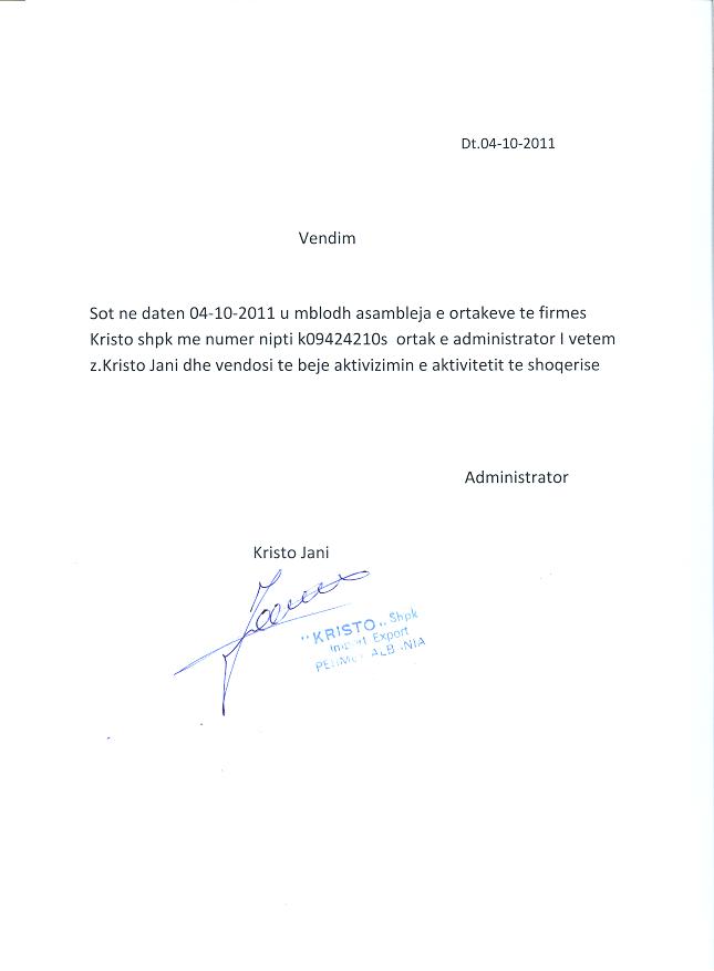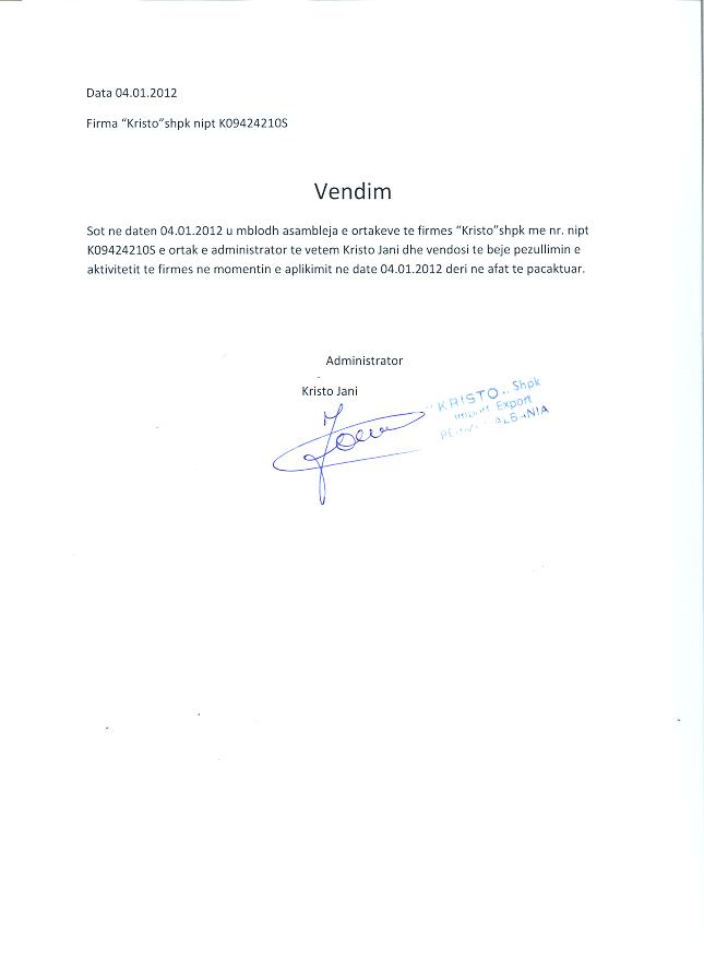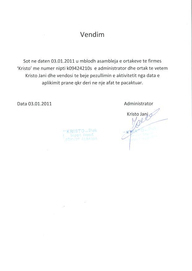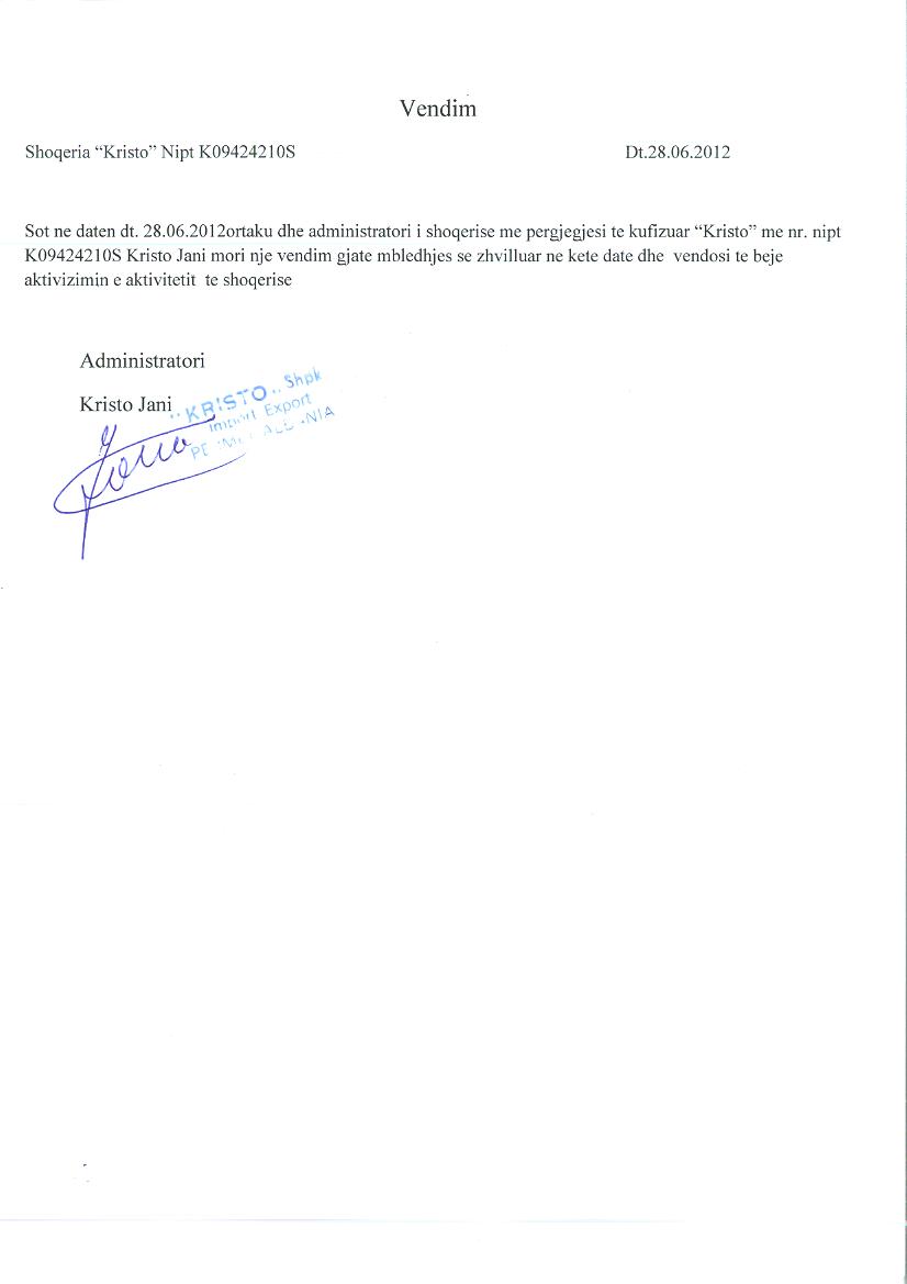 → Ekstrakt historik i regjistrit tregtar date 02.02.2022 → Akti i themelimit dhe statuti → Vendimi per aktivizimin e shoqerise date 04.10.2011 → Vendimi per pezullimin e aktivitetit date 04.01.2012 → Vendimi per aktivizimin e shoqerise date 28.06.2012 → Vendimi per pezullimin e shoqerise date 03.01.2011 |