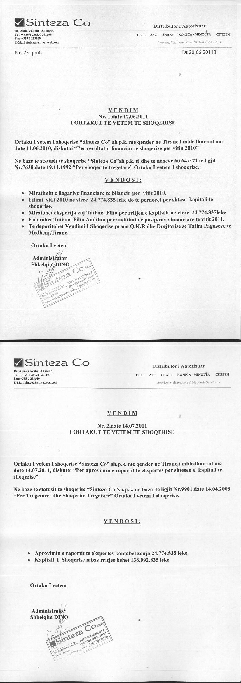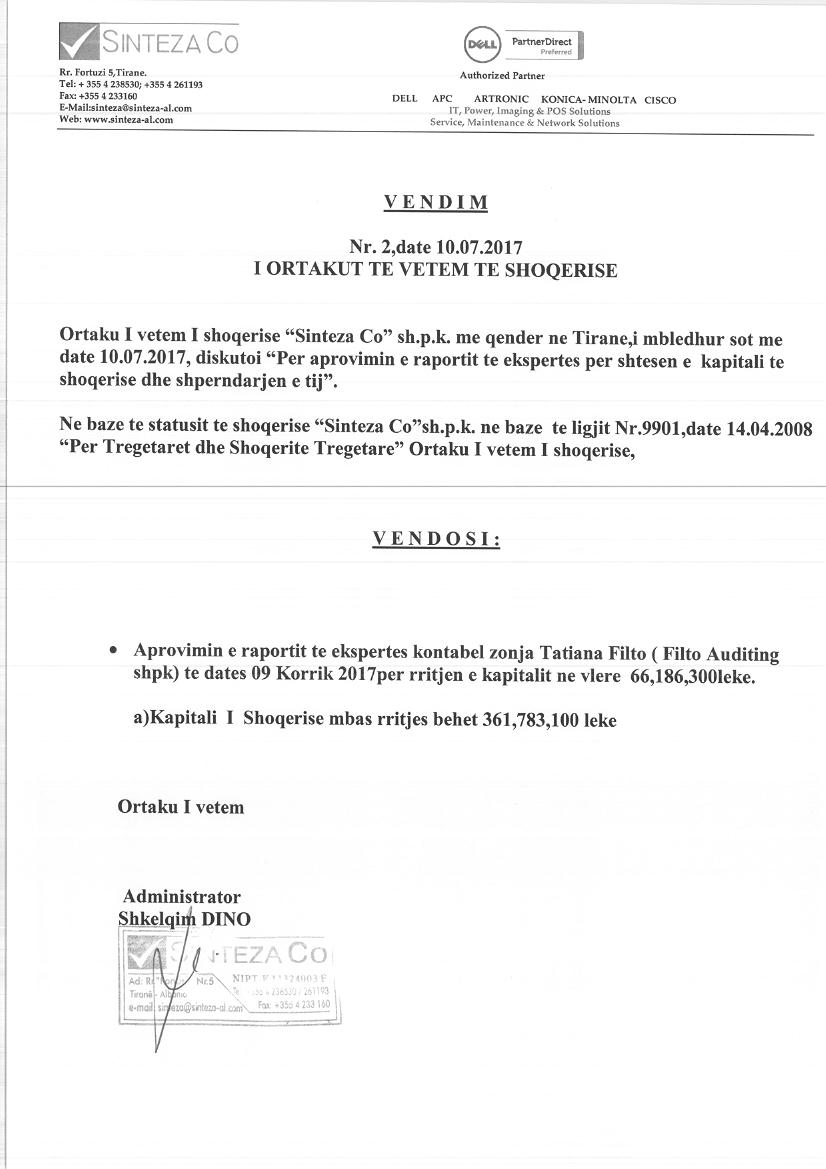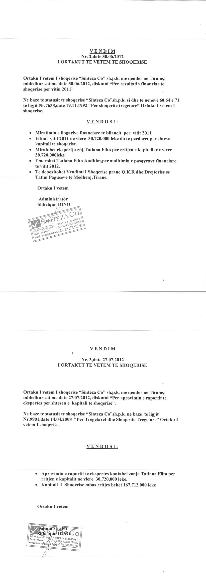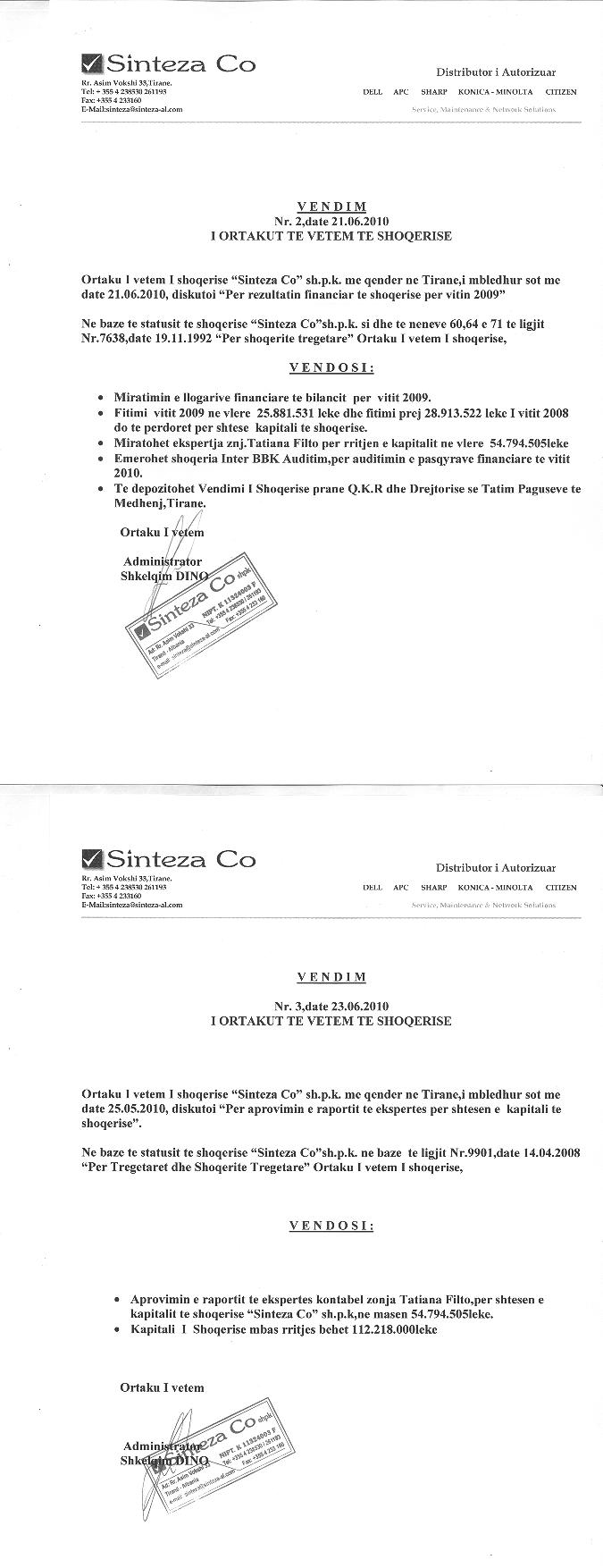 → Ekstrakti Historik i Regjistrit Tregtar date 20.06.2022 → Statuti i Shoqerise → Vendim i Asamblese se Pergjithshme per rritjen e kapitalit date 18.11.2008 → Vendim i Asamblese se Pergjithshme per rritjen e kapitalit date 21.06.2010 → Vendim i Asamblese se Pergjithshme per rritjen e kapitalit date 17.06.2011 → Vendim i Asamblese se Pergjithshme per rritjen e kapitalit date 30.06.2012 → Vendim i Asamblese se Pergjithshme per rritjen e kapitalit date 25.06.2013 → Vendim i Asamblese se Pergjithshme per rritjen e kapitalit date 25.06.2013 → Vendim i Asamblese se Pergjithshme per rritjen e kapitalit date 22.07.2014 → Vendim i Asamblese se Pergjithshme per rritjen e kapitalit date 23.07.2015 → Vendim i Asamblese se Pergjithshme per rritjen e kapitalit date 30.06.2016 → Vendim i Asamblese se Pergjithshme per rritjen e kapitalit date 10.07.2017 → Vendim i Asamblese se Pergjithshme per rritjen e kapitalit date 29.06.2018 → Ekstrakt Historik i Regjistrit Tregtar date 09.12.2024 |