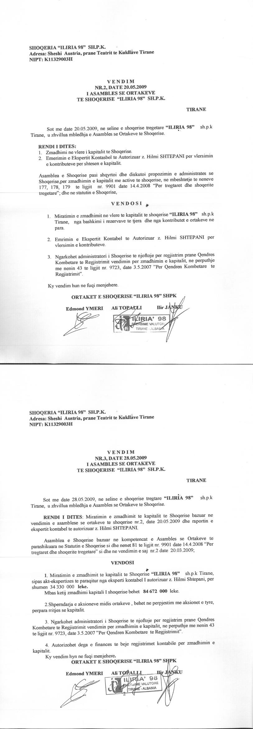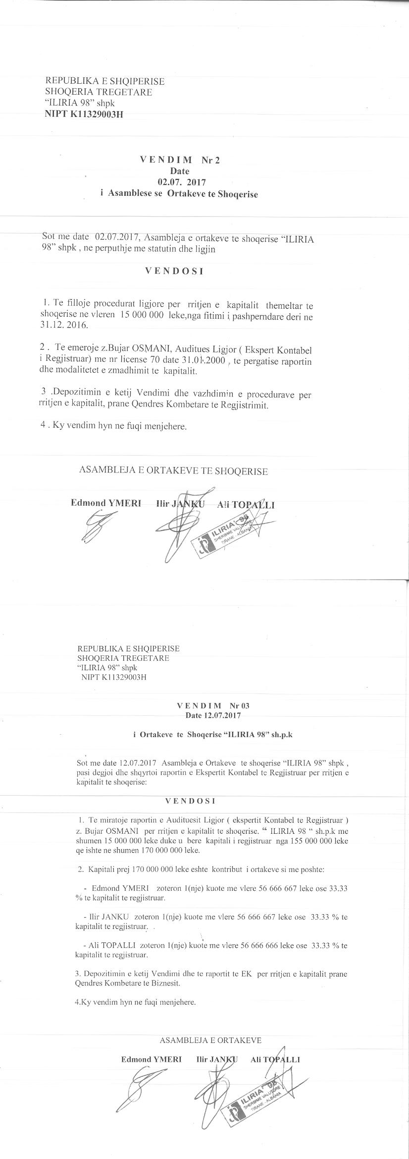 → Ekstrakt Historik i Regjistrit Tregtar date 28.07.2022 → Akt themelimi dhe Statuti i Shoqerise → Kontrate Dhurimi Kuotash date 20.11.1998 → Kontrate Shitje Kuotash date 31.03.1999 → Akt Zmadhim Kapitali date 10.08.2004 → Vendim i Asamblese se Ortakeve, Zmadhim Kapitali date 30.05.2006 → Vendim i Asamblese se Ortakeve, Zmadhim Kapitali date 28.05.2009 → Vendim i Asamblese se Ortakeve, Zmadhim Kapitali date 28.05.2011 → Vendim i Asamblese se Ortakeve, Zmadhim Kapitali date 21.05.2012 → Vendim i Asamblese se Ortakeve, Zmadhim Kapitali date 23.09.2013 → Vendim i Asamblese se Ortakeve, Zmadhim Kapitali date 04.09.2014 → Vendim i Asamblese se Ortakeve, Zmadhim Kapitali date 05.10.2015 → Vendim i Asamblese se Ortakeve, Zmadhim Kapitali date 11.07.2016 → Vendim i Asamblese se Ortakeve, Zmadhim Kapitali date 12.07.2017 → Vendim i Asamblese se Ortakeve, Zmadhim Kapitali date 02.09.2018 → Vendim i Asamblese se Ortakeve, Zmadhim Kapitali date 28.06.2021 |