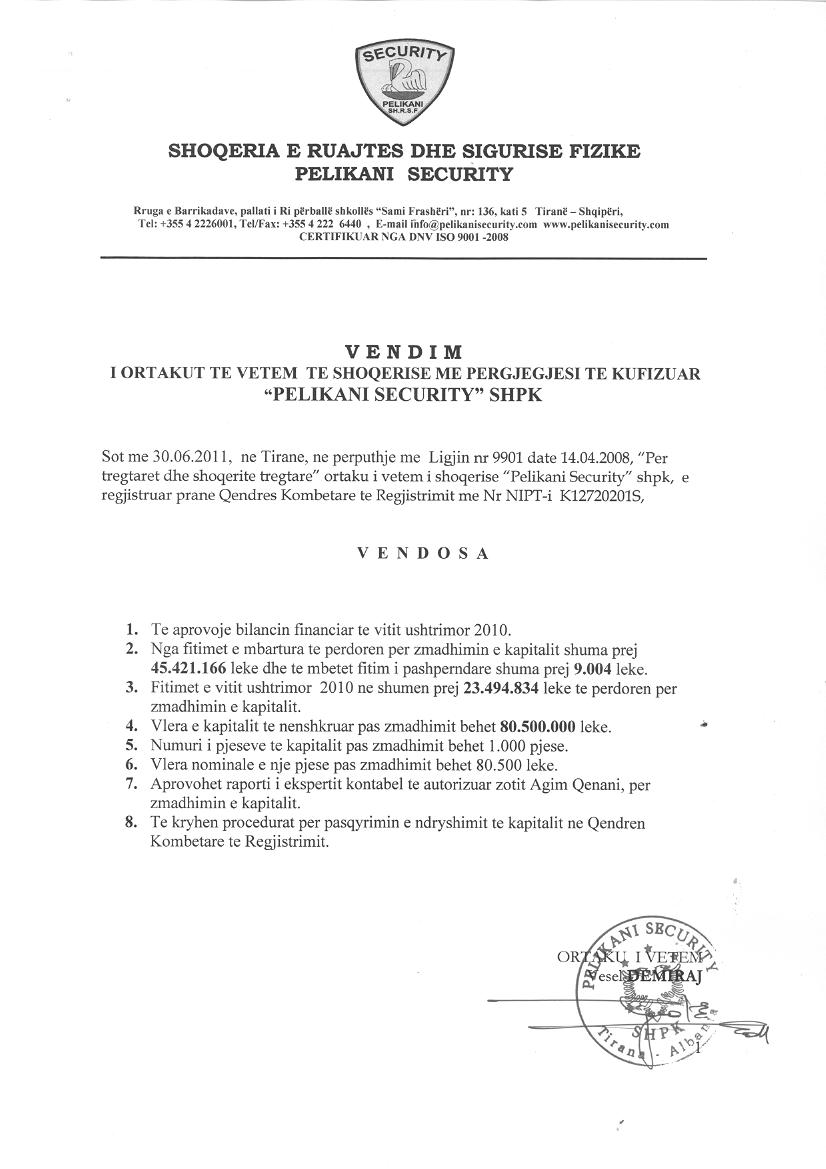 te shoqerise “PELIKANI SECURITY” sh.p.k., me NUIS(NIPT)- K11423005T, me