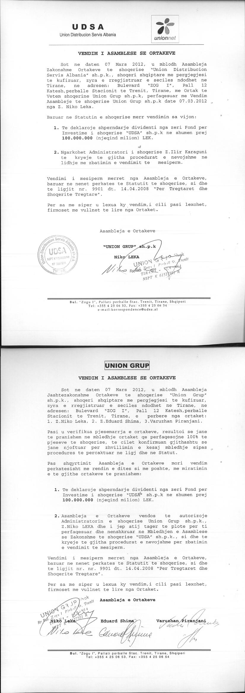 → Ekstrakti Historik i Regjistrit Tregtar date 07.11.2022 → Akt themelimi dhe Statuti i Shoqerise → Kontrate Shitje Kuotash date 26.12.2002 → Vendim i Asamblese se Ortakeve, Shperndarje Dividenti date 07.03.2012 → Vendim i Asamblese se Ortakeve, Anullim i Shperndarjes Dividentit te dates 07.03.2012, date 17.04.2012, → Vendim i Ortakut te Vetem, Zvogelim Kapitali dhe Shperndarje Dividenti date 04.09.2014 → Kontrate Tr./ Shitje Kuotash date 09.09.2014 → Vendim i Ortakut te Vetem, mbas perthithjes së shoqërisë "UNION NET" nga "UNION GRUP" ndryshohet ortaku i vetem i shoqërisë date 24.09.2020 → Vendim i Ortakut te Vetem, Zmadhim Kapitali date 09.09.2005 → Ekstrakti Historik i Regjistrit te Pronareve Perfitues date 07.11.2022 → Ekstrakt Historik i Regjistrit Tregtar date 05.07.2023 → Ekstrakt Historik i Regjistrit te Pronareve Perfitues date 05.07.2023 |