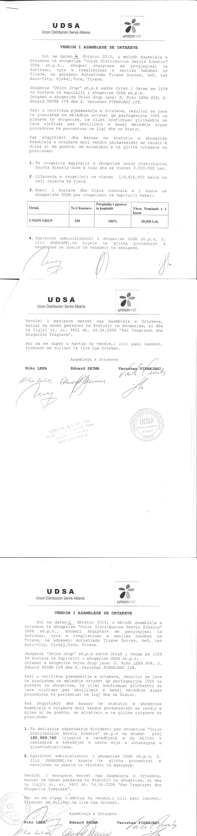 | Çështje Ligjore: | I. Me date 13/03/2012, me ane te vendimit te asamblese se ortakeve date 07.03.2012, u vendos te deklarohet shperndarja e dividentit nga zeri Fond per Investime i shoqerise "UDSA'shpk ne shumen prej 100.000.000 leke. II. Me date 13/03/2012, me ane te vendimit te "UNION GRUP"shpk date 07.03.2012, u vendos te deklarohet shperndarja e dividentit nga zeri Fond per Investime i shoqerise "UDSA" shpk ne shumen prej 100.000.000 leke. III. Me date 12/09/2012, me ane te vendimit te asamblese se ortakeve, date 17.04.2012, per anullimin e vendimite te asamblese se ortakeve te dates 07.03.2012 dhe per deklarimin e shperndarjes se dividentit nga zeri "Fond per Investime" i shoqerise "USDA" sh.p.k, ne shumen 90.000.000 leke. IV. Me date 04/09/2014, me ane te vendimit te ortakut te vetem, u vendos shperndarja e dividentit. |