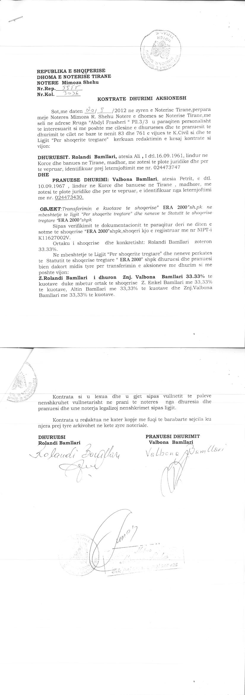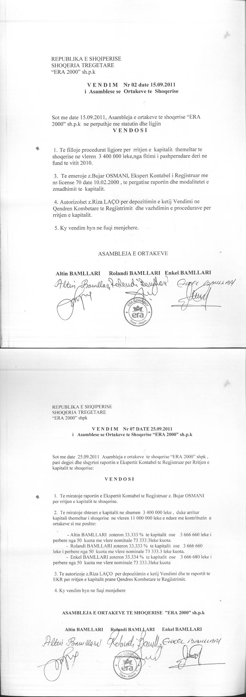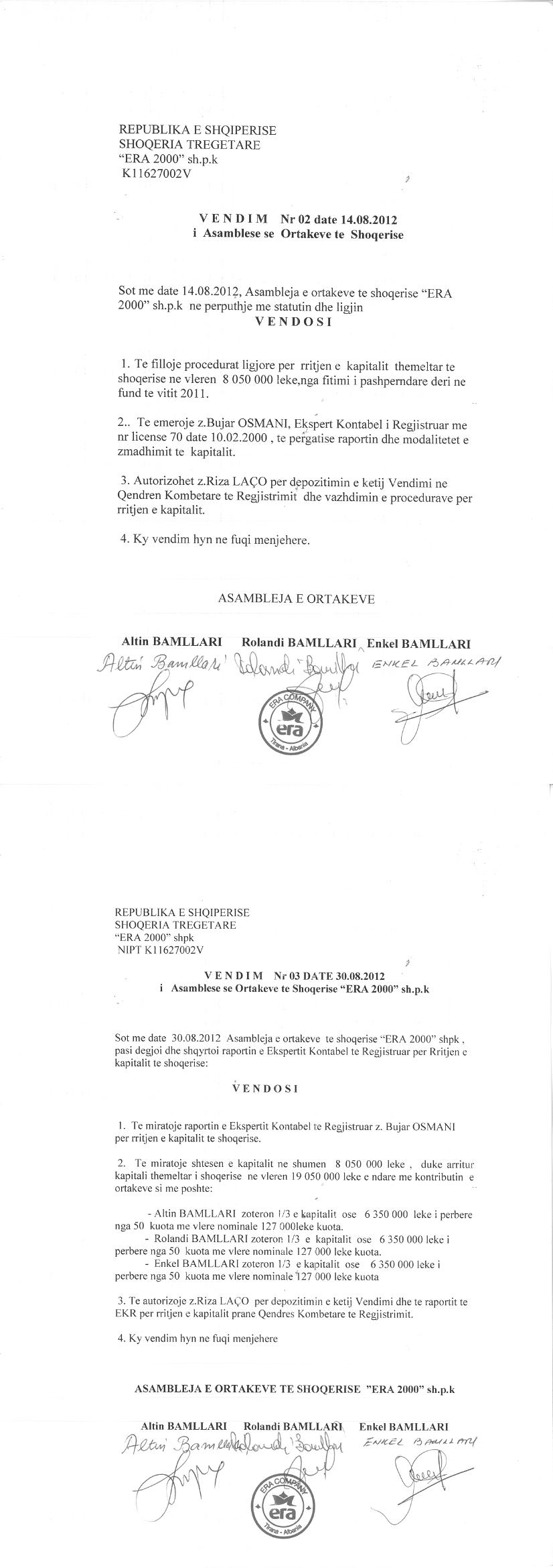 → Ekstrakt Historik i Regjistrit Tregtar date 06.06.2023 → Akt themelimi dhe Statuti i Shoqerise → Vendim i Asamblesë së Ortakëve, Zmadhim Kapitali datë 15.06.2005 → Vendim i Asamblesë së Ortakëve, Zmadhim Kapitali datë 15.09.2011 → Vendim i Asamblesë së Ortakëve, Zmadhim Kapitali datë 14.08.2012 → Kontratë Dhurimi Aksionesh datë 20.09.2012 → Vendim i Asamblesë së Ortakëve, Zmadhim Kapitali datë 05.08.2014 → Vendim i Asamblesë së Ortakëve, Zmadhim Kapitali datë 09.07.2015 → Urdhër për Vënien e Sekuestros datë 31.05.2016 → Urdhër për Pushimin e Ekzekutimit datë 01.06.2016 → Vendim i Asamblesë së Ortakëve, Zmadhim Kapitali datë 06.07.2016 → Vendim i Asamblesë së Ortakëve, Zmadhim Kapitali datë 22.08.2017 → Vendim i Asamblesë së Ortakëve, Zmadhim Kapitali datë 14.09.2018 → Kontratë Dhurimi e Pjesëve të Kapitalit datë 21.08.2020 |