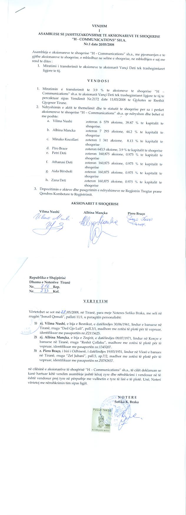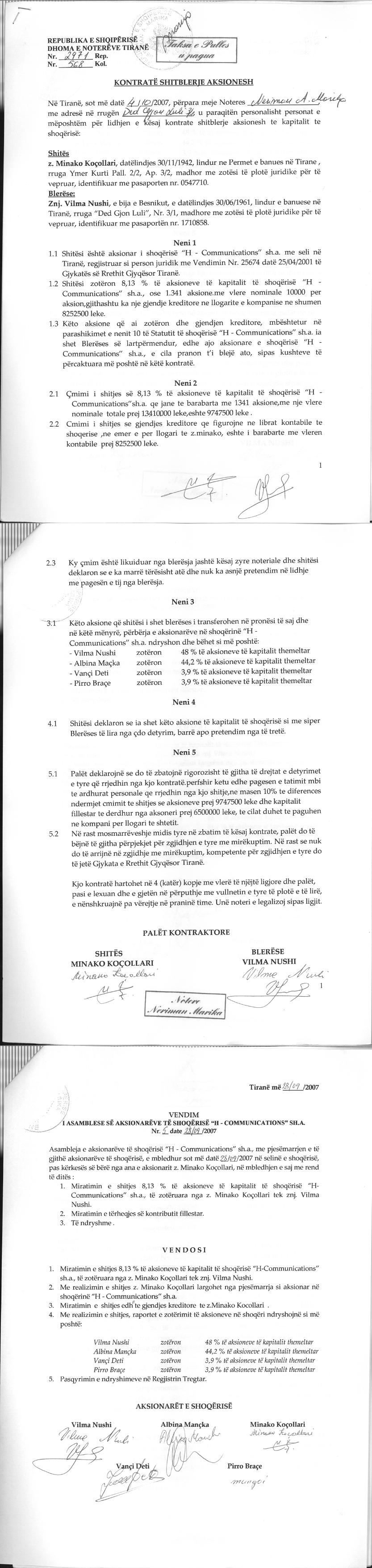 dhe Nr.1247, te cilat jane pjese integrale e kesaj kontrate eshte 180.854.885 leke. II. Me date 30.11.2006, me ane te vendimit te Asamblese se Aksionerve te shoqerise, eshte vendosur bashkimi me perthithje te shoqerise “H-Communications” sha me shoqerine “Hermes” shpk. III. Sipas Vendimit te Asamblese se Pergjithshme date 19.05.2010 , eshte ndryshuar statusi i shoqerise nga aktiv ne Shoqeri ne Likuidim e Siper. IV. Sipas Vendimit te Asamblese se Pergjithshme date 19.05.2010 , eshte ndryshuar statusi i shoqerise nga Shoqeri ne Likuidim e Siper ne te Çregjistruar. |