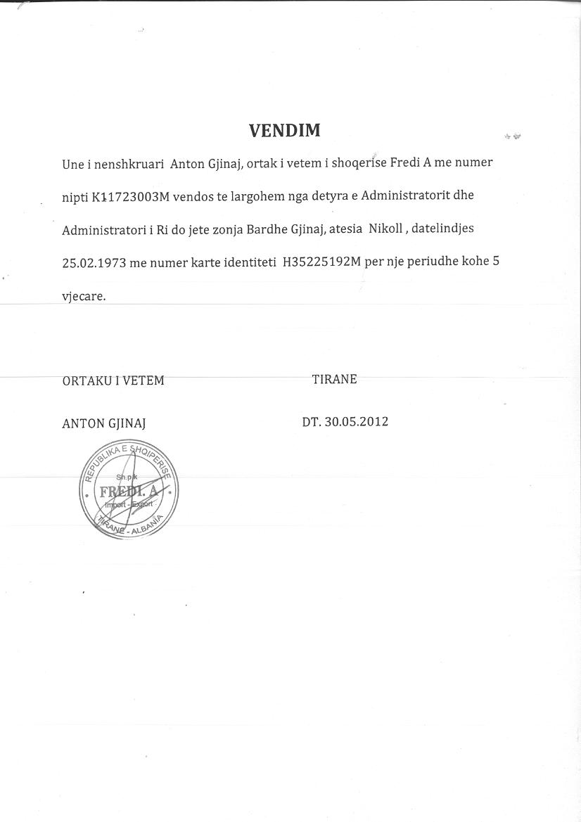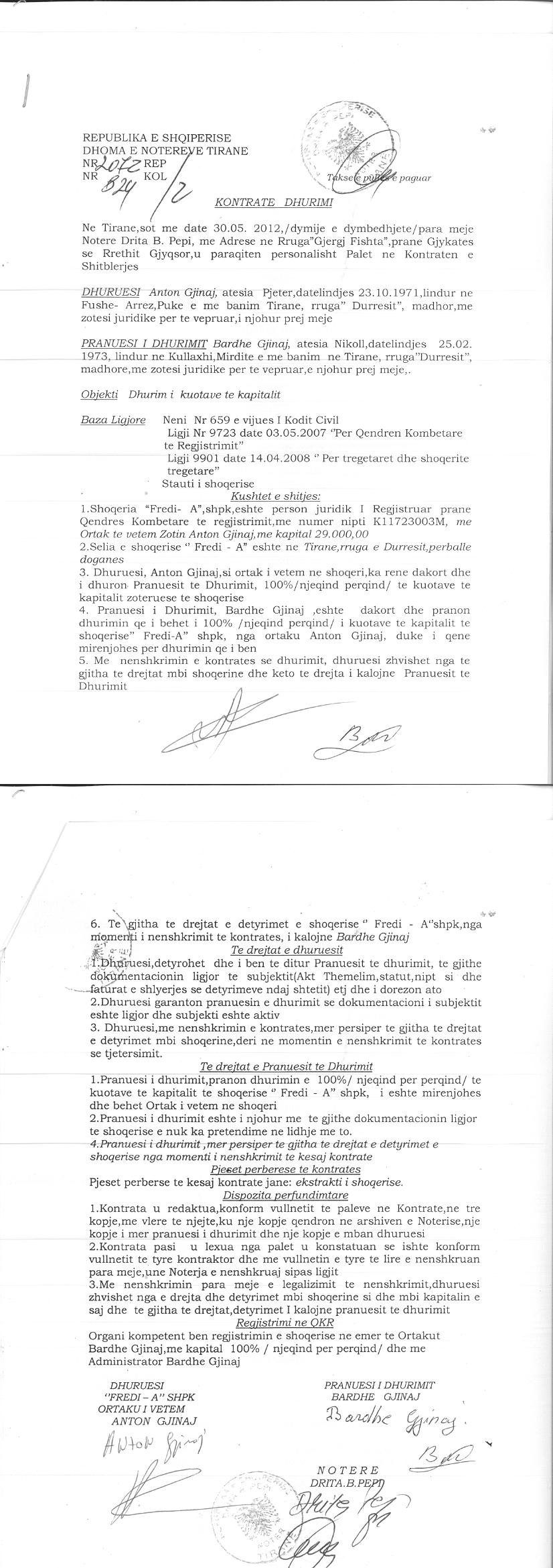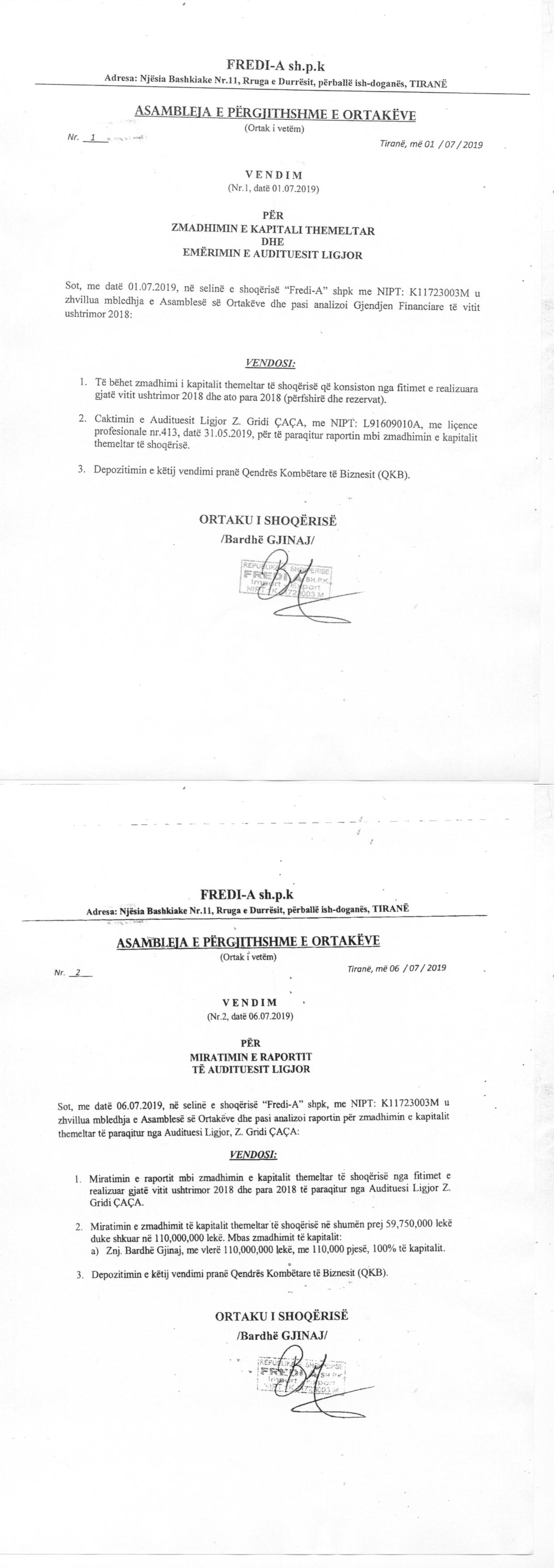→ Ekstrakt Historik i Regjistrit Tregtar, date 29.11.2021 → Kontrate shitje kuotash, date 30.05.2012 → Vendimi i Ortakut te vetem, date 30.05.2012 → Vendimi i Ortakut te vetem date 21.11.2013 → Vendimi i Ortakut te vetem, date 28.07.2015 → Vendimi i Ortakut te vetem ,date 16.11.2015 → Vendimi i Ortakut te vetem, date 25.11.2016 → Vendimi i Ortakut te vetem, date 26.07.2018 → Vendimi i Ortakut te vetem , date 06.07.2019 |
