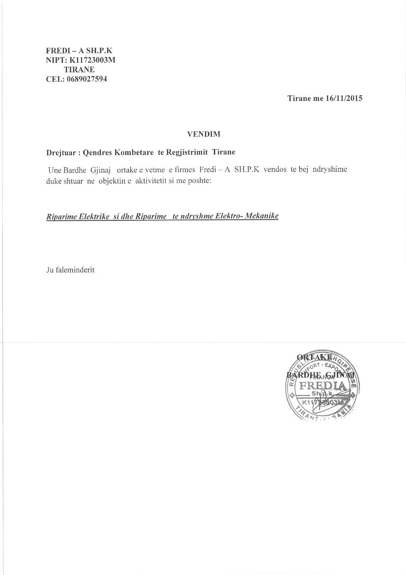 | Mjete të ushtrimit të aktivitetit: | Tirane, Mjeti me targe AA 512 SY Tirane,Mjeti me targe TR 0384 R Tirane,Mjeti me targe TR 5230 P |