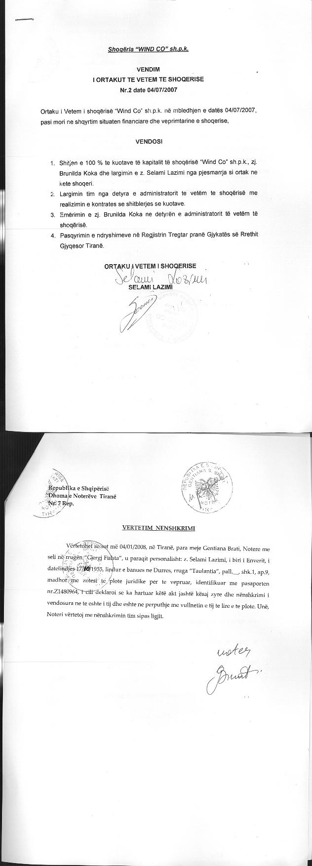 mbi kuotat /aksonet e pales debitore, shoqeria “WIND CO” sh.p.k pajisur me NUIS (