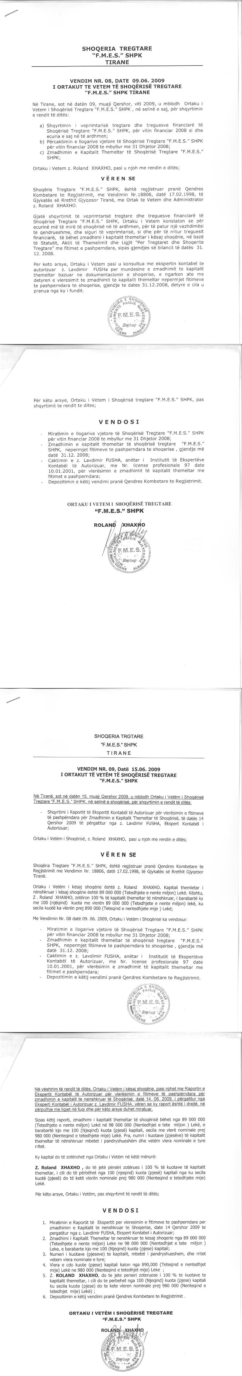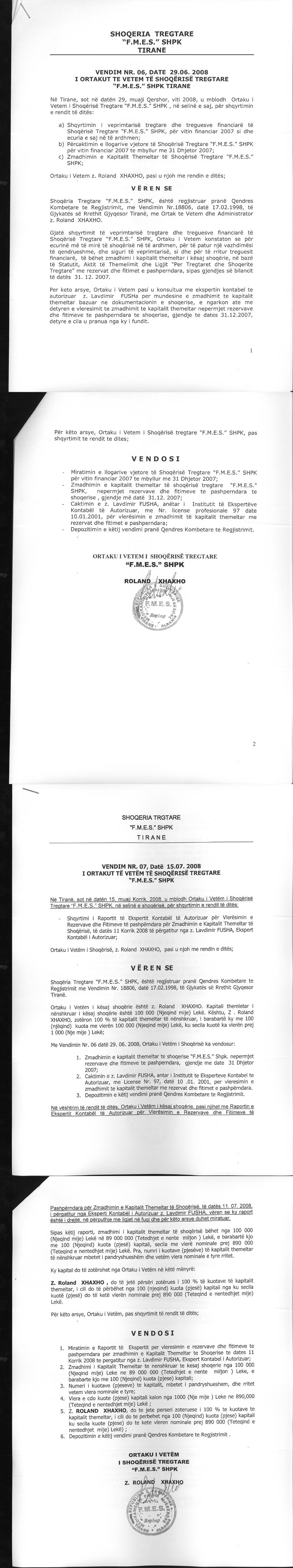 → Ekstrakt historik i regjistrit tregtar 05.02.2021 → Akti i themelimit dhe statuti → Kontrate dhurimi kuotash 11.01.2007 → Vendim i ortakut te vetem per zmadhimin e kapitalit 09.06.2009 → Vendim i ortakut te vetem per zmadhimin e kapitalit 29.06.2008 → Vendimi i ortakut te vetem per zmadhimin e kapitalit 30.06.2016 |