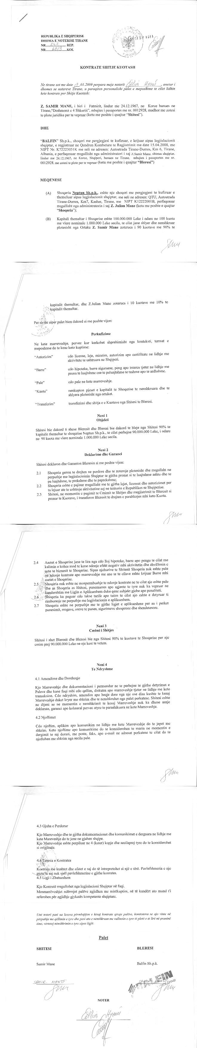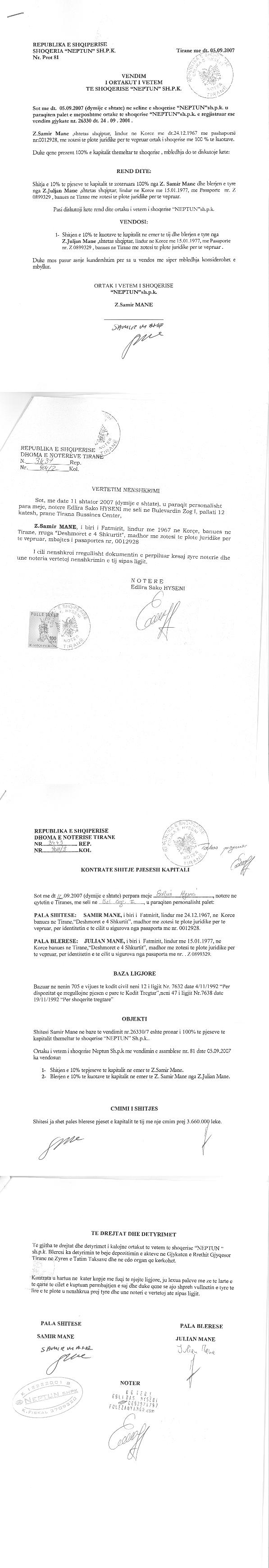 → Ekstrakt historik i regjistrit tregtar date 10.12.2023 → Akti i themelimit dhe statuti → Vendimi i ortakut te vetem per shitjen e kuotave date 05.09.2007 → Kontrate shitje kuotash date 19.01.2009 → Vendimi i ortakut te vetem per rritjen e kapitalit date 19.12.2008 → Ekstrakt Historik i Regjistrit te Pronareve Perfitues date 12.10.2023 → Ekstrakt Historik i Regjistrit Tregtar date 30.09.2024 → Ekstrakt Historik i Regjistrit te Pronareve Perfitues date 30.09.2024 |