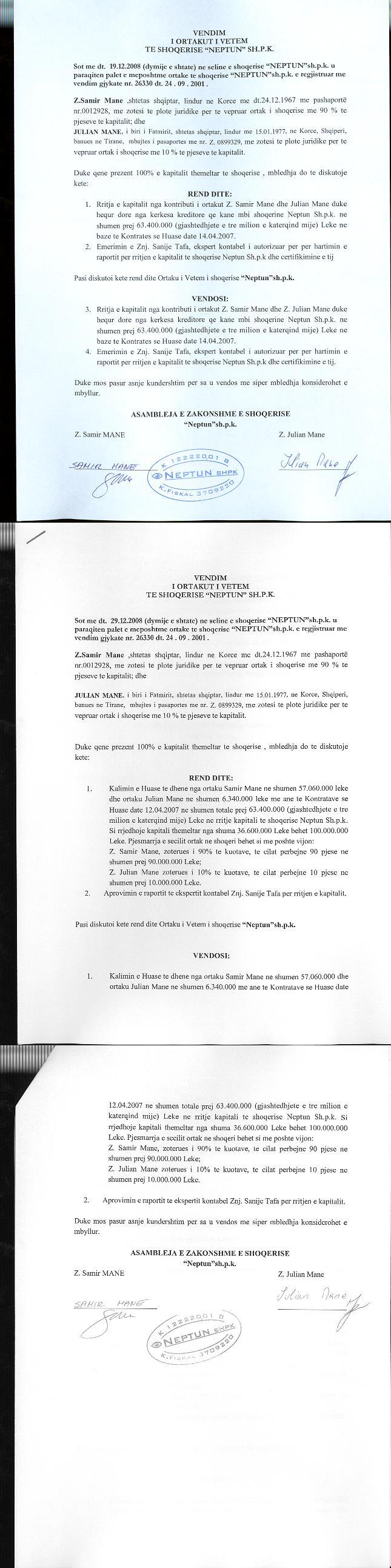 | Çështje Ligjore: | Me date 15.10.2004, me vendim te asamblese se ortakeve, u miratua raporti i ekspertit kontabel per bashkimin nepermjet perthithjes te shoqerise "NEPTUN" shpk (shoqeria perthithese) me A.S.E. shpk (shoqeria e perthithur). Kapitali i shoqerise A.S.E. do te kaloje per shoqerine perthithese NEPTUN. Si pasoje e bashkimit, kapitali i shoqerise NEPTUN do te rritet ne vleren 1.900.000 (nje milion e nenteqind mije) leke nepermjet emetimit te 18.900 pjeseve te reja. Pas kesaj ortake te shoqerise behen Saimir Mane me 80% dhe Armand Mane me 20% te kuotave te kapitalit. |