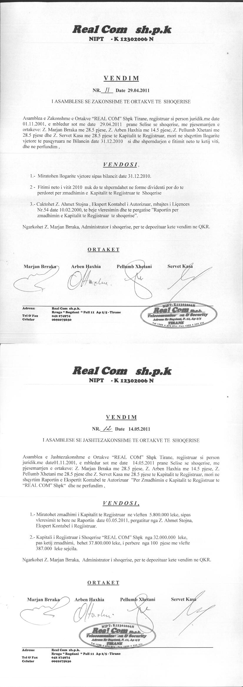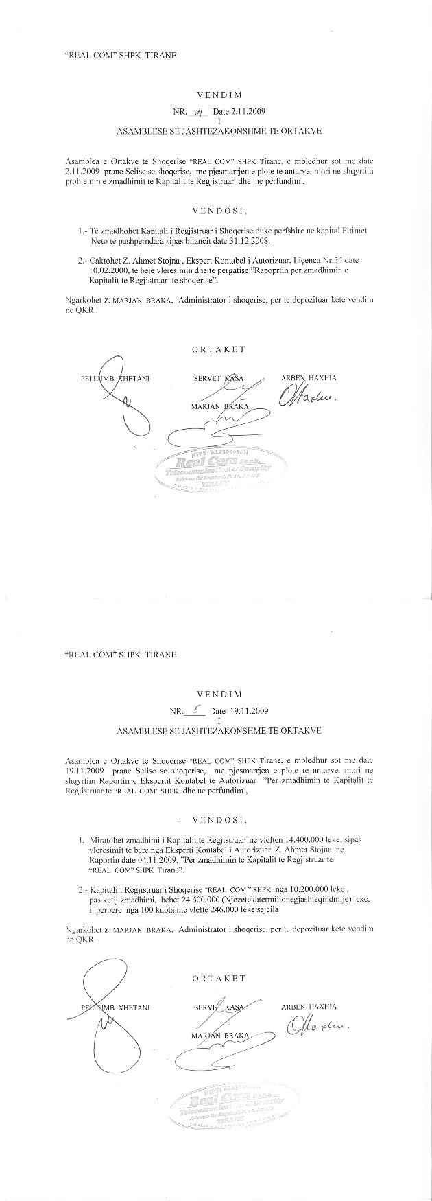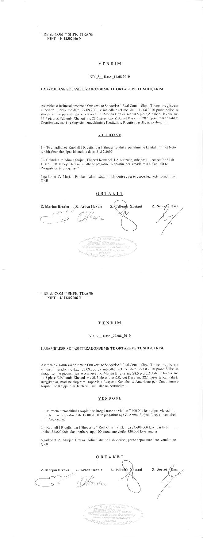 → Ekstrakt historik i regjistrit tregtar date 09.06.2022 → Akti i themelimit → Vendim I asamblese se ortakeve (2010) → Vendim I asamblese se ortakeve (2011) → Vendim I asamblese se ortakeve (2009) → Kontrate dhurimi kuotash (2018) → Ekstrakt Historik i Regjistrit Tregtar date 05.02.2025 |