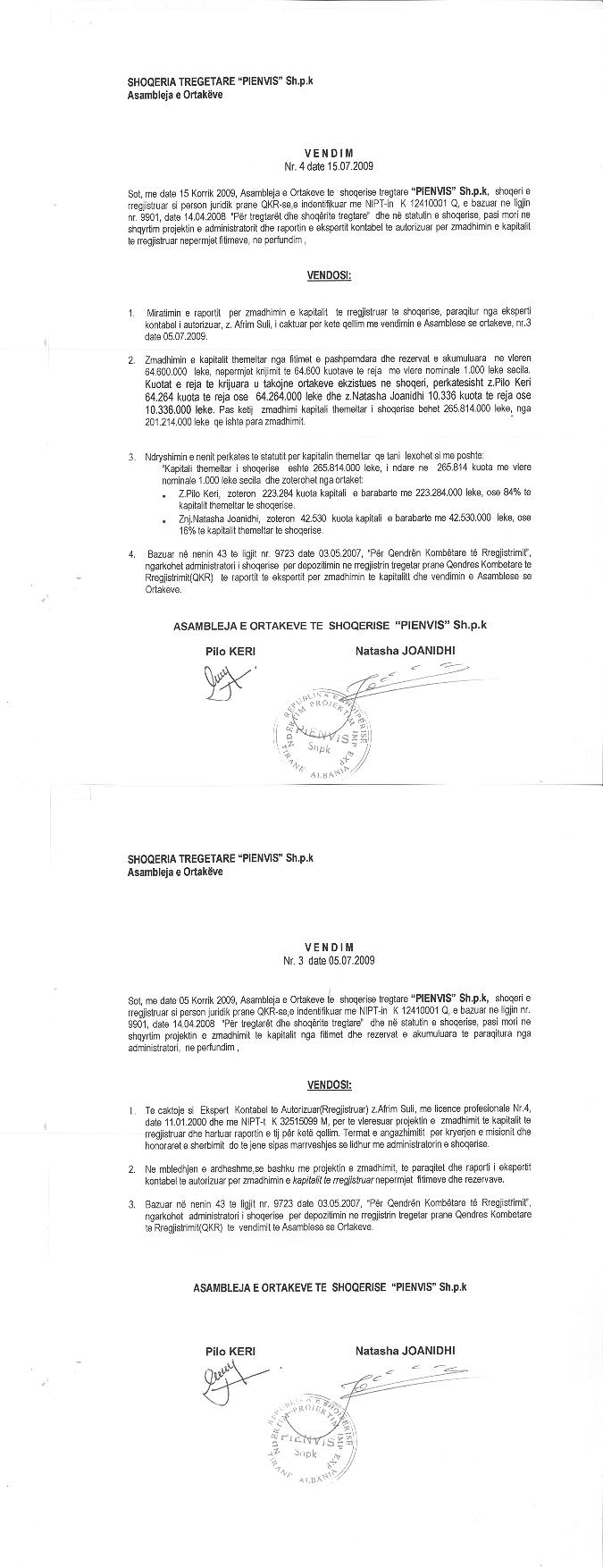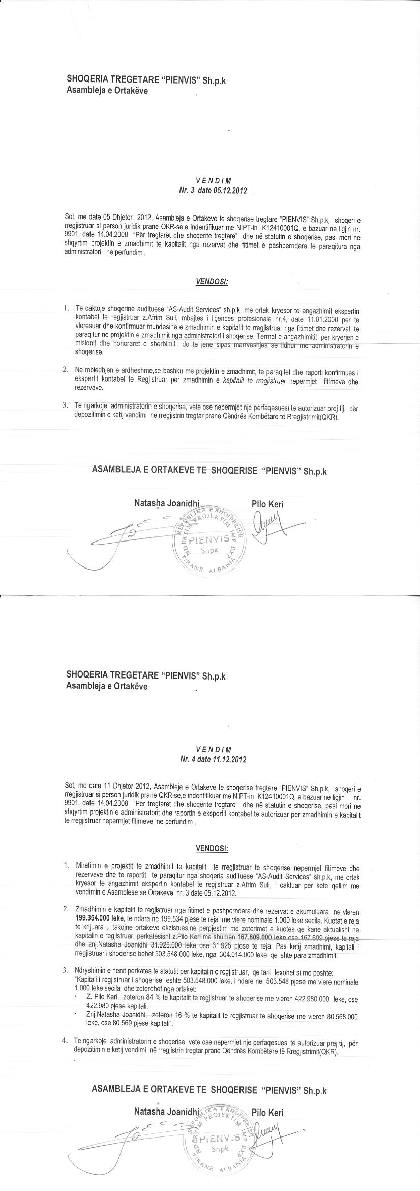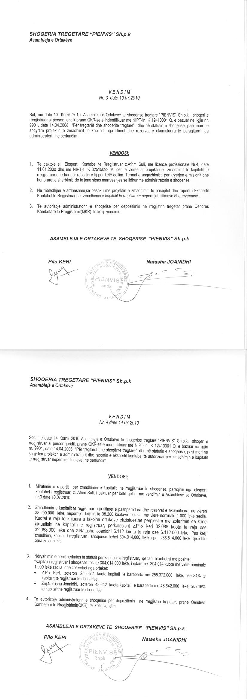 → Ekstrakt historik i regjistrit tregtar 02.03.2021 → Dokumenta te ndryshem → Akti I themelimit → Kontrate shitblerje kuotash kapitali 22.12.2006 → Vendimi I asamblese se ortakeve per zmadhimin e kapitalit 15.07.2009 → Vendimi per miratimin e raportit te zmadhimit te kapitalit 14.07.2010 → Vendimi per miratimin e raportit te zmadhimit te kapitalit 11.12.2012 → Urdher per vendosjen e sekuestros konservative 25.07.2016 → Urdher per heqjen e sekuestros konservative 26.07.2016 → Urdher per heqjen e sekuestros konservative 23.02.2018 |