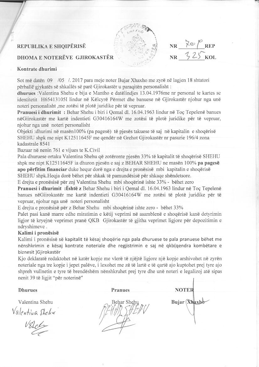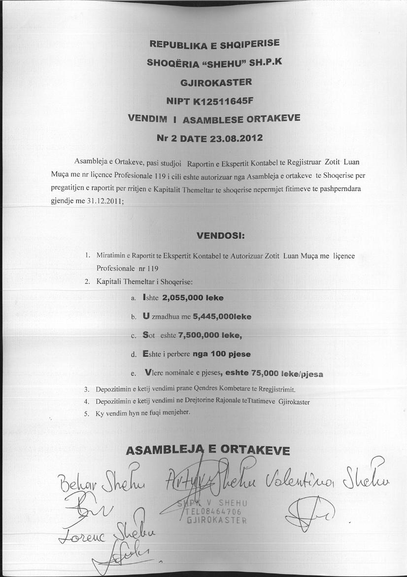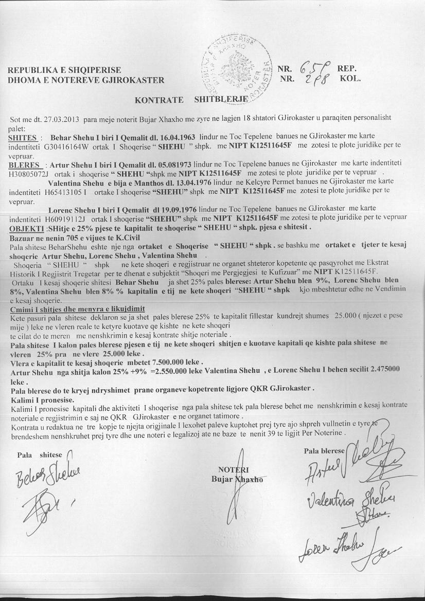 → Ekstrakti Historik i Regjistrit Tregtar date 14.12.2021 → Statuti fillestar i shoqerise dhe dokumenta te ndryshme → Statuti i Shoqerise → Vendimi i Asamblese se ortakeve per rritjen e kapitalit date 23.08.2012 → Kontrate e Shit-Blerjes se Kuotave date 27.03.2013 → Kontrate e Dhurimit te kuotave date 09.05.2017 |