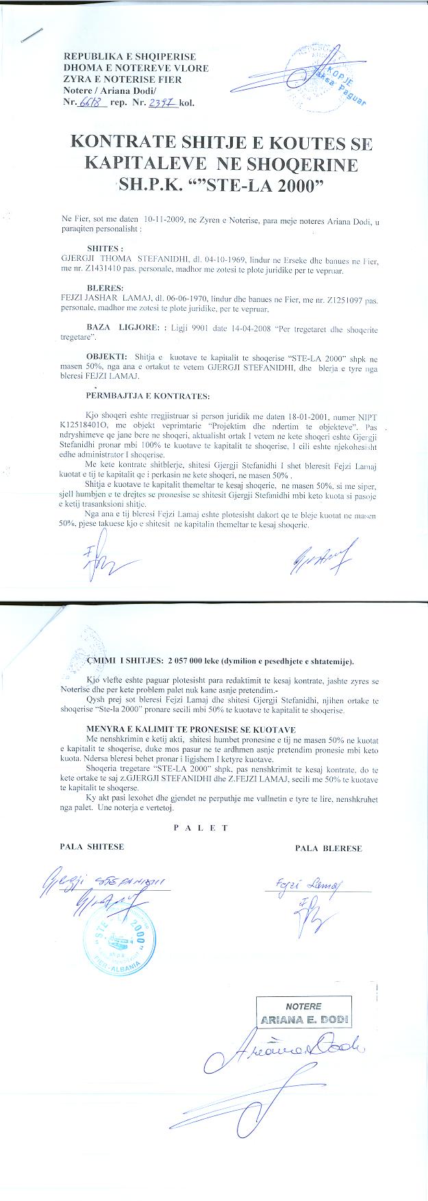→ Ekstrakt historik i regjistrit tregtar date 18.07.2021 → Akti i themelimit → Kontrate shitje te kuotave te kapitalit date 15.10.2004 → Kontrate shitje e kuotave te kapitalit date 10.11.2009 |