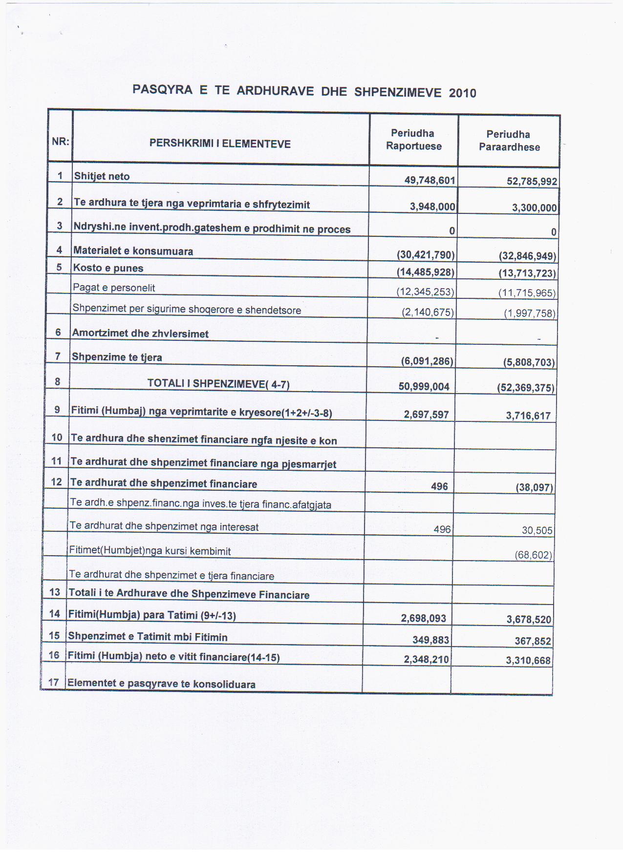 9 406 874,00 Fitimi para Tatimit(Lekë) 2021: 8 118 823,00 Fitimi para Tatimit(Lekë) 2020: 1 942 240,00 Fitimi para Tatimit(Lekë) 2019: 6 746 869,00 Fitimi para Tatimit(Lekë) 2018: 6 324 554,00 Fitimi para Tatimit(Lekë) 2017: 5 126 431,00 Fitimi para Tatimit(Lekë) 2016: 7 878 944,00 Fitimi para Tatimit(Lekë) 2015: 3 536 676,00 Fitimi para Tatimit(Lekë) 2014: 1 550 104,00 Fitimi para Tatimit(Lekë) 2013: 1 181 010,00 Fitimi para Tatimit(Lekë) 2012: 1 557 790,00 Fitimi para Tatimit(Lekë) 2011: 2 014 198,00 Fitimi para Tatimit(Lekë) 2010: 2 698 093,00 Fitimi para Tatimit(Lekë) 2009: 3 678 520,00 |