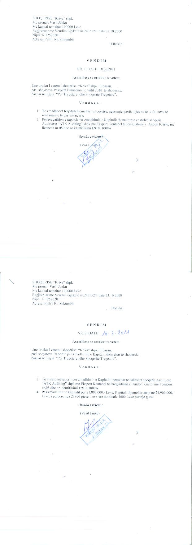 → Ekstrakt Historik i Regjistrit Tregtar date 04.07.2023 → Akt themelimi dhe Statuti i Shoqerise → Dokumenta të Ndryshëm → Vendim i Ortakut të Vetëm, Zmadhim Kapitali datë 18.06.2011 |