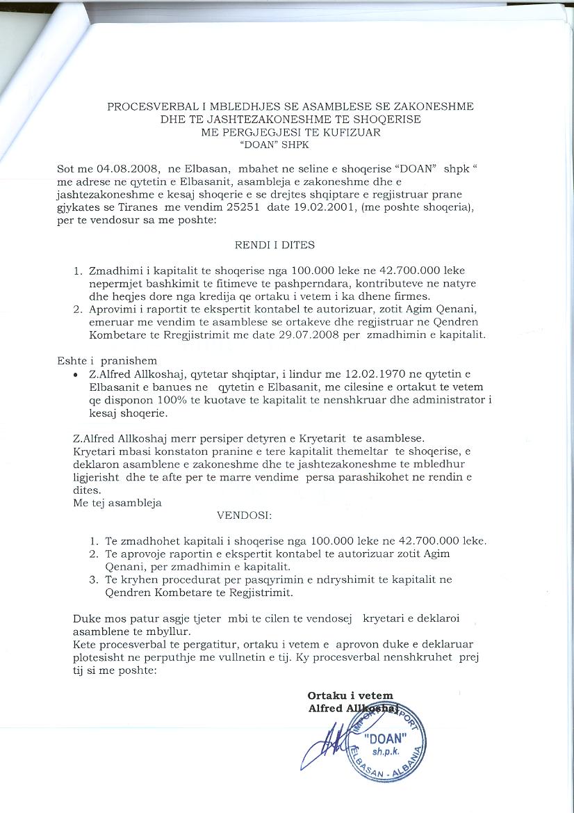 → Ekstrakt Historik i Regjistrit Tregtar date 12.09.2024 → Akt themelimi dhe Statuti i Shoqerise → Vendim i Ortakut të Vetëm, Zmadhim Kapitali datë 04.08.2008 → Vendim i Ortakut të Vetëm, Zvogëlim Kapitali datë 20.11.2018 → Kontratë Shitblerje Kuotash Kapitali datë 11.12.2019 → Vendim i Asamblesë së Ortakëve, Zmadhim Kapitali datë 05.12.2021 → Vendim i Asamblesë së Ortakëve, Zmadhim Kapitali datë 20.12.2023 |
