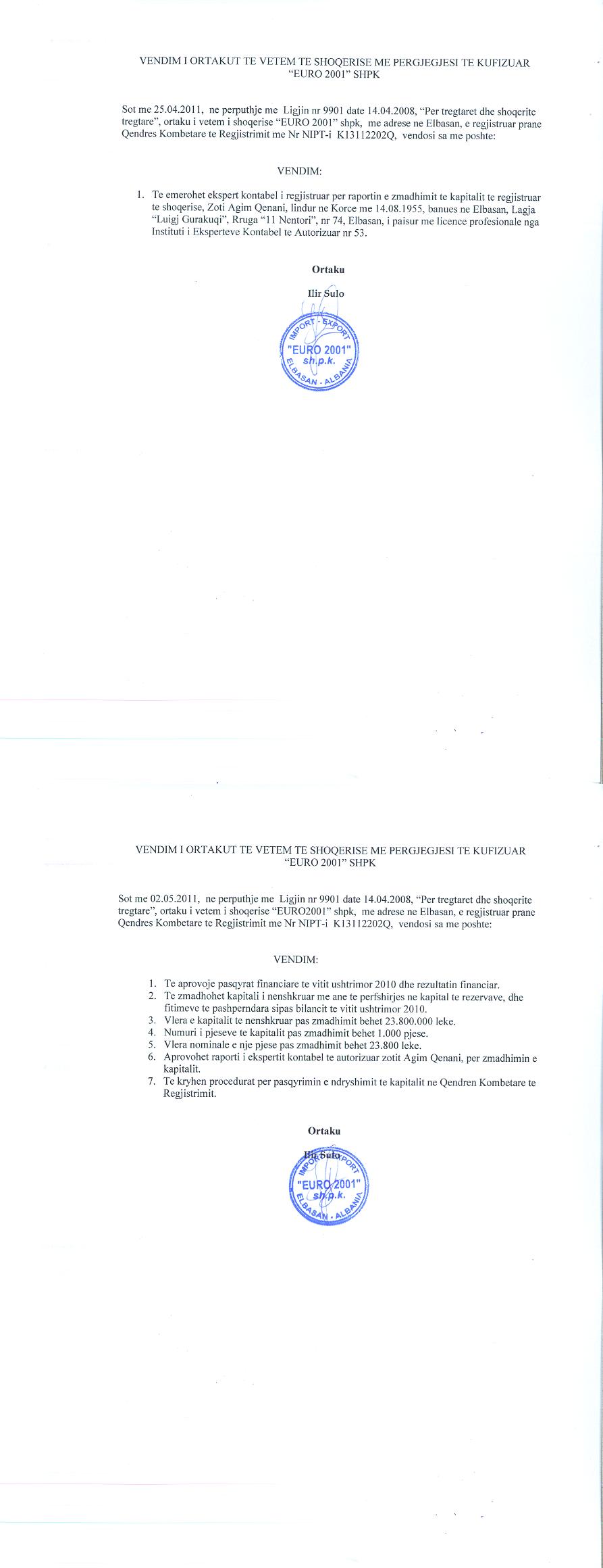 → Ekstrakti Historik i Regjistrit Tregtar date 23.11.2021 → Statusi fillestar i shoqerise dhe Kontrata e Shitjes → Statuti i Shoqerise → Vendim i ortakut te vetëm per rritjen e kapitalit date 02.05.2011 |